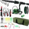 Kit de inicio de pesca todo en uno: los combos de pesca incluyen caña de pescar plegable + carrete giratorio + hilo de pescar + alicates de pesca + pinza de labios de pescado + carrete de línea + señuelos suaves y duros, ganchos + bolsa de transporte portátil. Satisface las necesidades de los entusiastas de la pesca, pescadores, ideal para la pesca de trucha lubina, pesca de arroyo, pesca de curricán, pesca, pesca de surf en el océano. Caña de pesca retráctil: las cañas de pescar plegables están hechas de fibra de carbono ligera, sensible y resistente. Caña de pesca resistente de 6.89 pies con guías de acero inoxidable suaves para proporcionar un rendimiento ultra suave y mango de EVA de alta densidad para proporcionar comodidad y mejorar la durabilidad Potente carrete de pesca: carrete giratorio con carrete de aluminio mecanizado CNC más fuerte, relación de engranaje: 5.5:1, rodamientos de bolas resistentes a la corrosión, sistema de arrastre de chapado UV, balancín izquierdo/derecho intercambiable y perilla de mango cómodo, te hace disfrutar de los mejores viajes de pesca Varios accesorios: línea de pesca trenzada de alta tenacidad, varios señuelos de pesca y giratorios de pesca, los ganchos están empaquetados en una caja compacta de aparejos de plástico. Un mini carrete de línea se añade especialmente a la línea de pesca de carrete en su carrete fácilmente. Adecuado para pesca de agua dulce y salada Alicates de pesca y agarrador de labios de pescado: juego de herramientas de pesca perfecto para profesionales y principiantes, protege tus dedos, atrapa peces con una sola mano rápida y fácilmente con un agarrador de peces; mientras que los alicates se utilizan principalmente para cortar líneas de pesca, quitar anzuelos, dividir anillos y ajustar cebos
