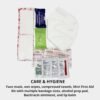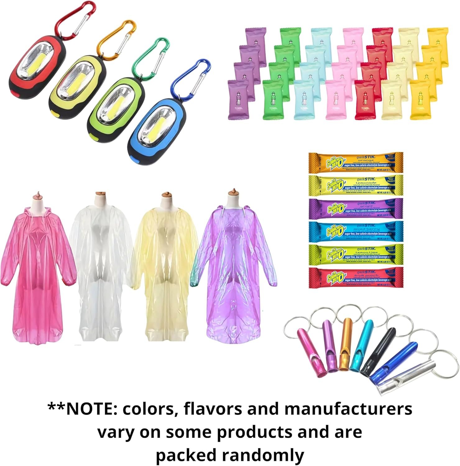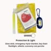 Componentes incluidos: linterna de llavero, bolsas de agua vacías, electrolitos, agua de emergencia, manta de emergencia, mini botiquín de primeros auxilios