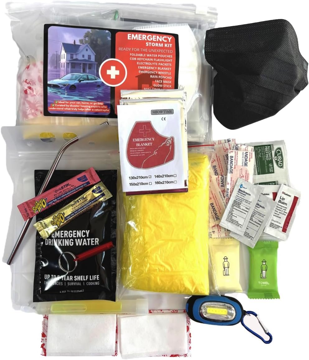 Compacto, portátil y fácil de almacenar: el kit de emergencia ligero para llevar cabe en una mochila, cajón de escritorio o maletero sin ocupar espacio. Perfecto para evacuación rápida, viajes por carretera, camping, o mantenerse a mano durante la temporada de tormentas y desastres inesperados. Cubre necesidades críticas de emergencia: cada kit de supervivencia proporciona los elementos esenciales para hidratación, calidez, visibilidad, higiene y primeros auxilios. Diseñado para ayudarlo a mantenerse seguro y cómodo cuando tormentas, cortes o desastres naturales interrumpen la vida cotidiana. 15 esenciales, 31 piezas en total. Incluye bolsas de agua, paquetes de electrolitos, linterna, poncho, manta térmica, vendajes de primeros auxilios, artículos de higiene y mucho más. Cada artículo es elegido por su fiabilidad, durabilidad y preparación diaria para desastres. Tranquilidad para el hogar, el automóvil y los viajes: un kit confiable de preparación para emergencias en el que puedes confiar para huracanes, apagones, campamentos, viajes por carretera o seguridad en el lugar de trabajo. Mantente listo en cualquier lugar sin la molestia del voluminoso equipo de supervivencia. Ideal para familias y regalos: un maravilloso regalo de preparación para emergencias para seres queridos, estudiantes universitarios o nuevos propietarios. Tener varios kits garantiza tranquilidad para la seguridad familiar durante tormentas, cortes o evacuaciones. Uso versátil más allá de las tormentas: no solo para huracanes o apagones, esta bolsa de emergencia todo en uno es útil para terremotos, incendios forestales, viajes de campamento, viajes por carretera y seguridad diaria en el automóvil. Una adición confiable a cualquier plan de emergencia doméstica. Práctico y fácil de usar: diseñado para cualquier persona, desde familias hasta compradores por primera vez, este kit de supervivencia fácil de usar no requiere configuración ni entrenamiento. Todos los suministros están preempaquetados, claramente organizados y listos para usar durante emergencias estresantes, por lo que puede actuar rápido cuando más importa.