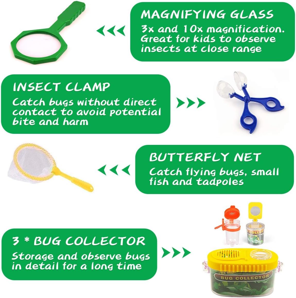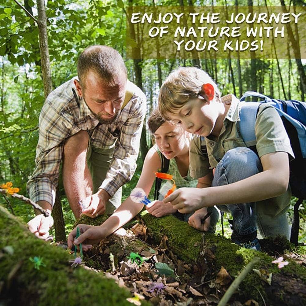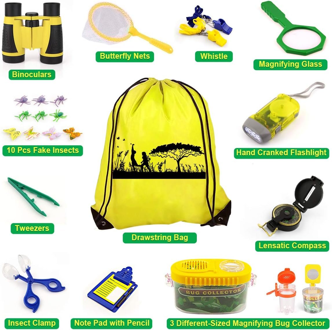 Kit de explorador para exteriores de 24 piezas: el kit de aventura para niños de kaqinu proporciona 24 accesorios necesarios para explorador, incluyendo binoculares, brújula, silbato, linterna, lupa, red de mariposas, pinzas, abrazadera de insectos, colector de insectos, insectos falsos, bloc de notas y bolsa con cordón para llevar fácilmente al exterior y almacenamiento. Un artículo esencial de camping para niños. Explora el mundo circundante: este paquete de juguetes de campamento de aventura contiene todo lo que los jóvenes exploradores necesitan. Los prismáticos de alta calidad ayudan a los niños a detectar el entorno circundante. La brújula lensatic enseña a los niños a aprender a encontrar la dirección correcta y ubicar posiciones en mapas o en el campo. Una brillante linterna de manivela que extiende fácilmente la felicidad del niño a la noche. Cada silbato viene con un cordón, tus hijos pueden colgarse de su cuello fácilmente. [Aprende sobre insectos e insectos] – 4 aumentos para examinar plantas, insectos y rocas. Maravillosamente divertido para viajes de campamento e investigaciones al aire libre o en interiores. Use la abrazadera para insectos y la red de mariposas para atrapar insectos que le interesan. Los niños no tienen que tocar los insectos. Y los recolectores de errores pueden hacer que pequeños insectos te acompañen durante más tiempo. El mejor regalo educativo para niños: si estás buscando un regalo perfecto para niños que respalde el aprendizaje STEM, anima a tus hijos a explorar el aire libre y desarrollar habilidades de la vida real, estimula el deseo natural de ser uno con la naturaleza, este es el juego para ti. También es un excelente regalo para cumpleaños, vacaciones y cualquier otra ocasión. Lo recomendamos encarecidamente para niños de 3 a 12 años. [Intimímate con la naturaleza] – ¡No más televisión y videojuegos! Deja que tus hijos se mantengan alejados de los dispositivos electrónicos y los motive a salir, jugar con este equipo de campamento para niños de la naturaleza, ayuda a los niños a explorar el entorno natural y aprender sobre su entorno de verdad.