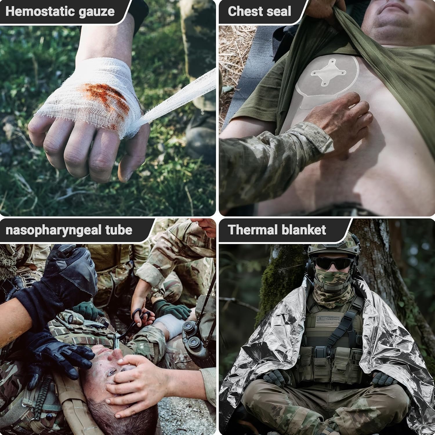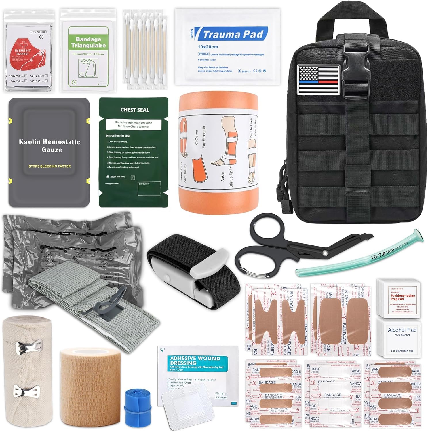 Manejo de la hemostasia: este kit de primeros auxilios de supervivencia incluye las soluciones de hemostasia más fáciles de usar, compactas y populares del mercado, incluyendo: torniquetes a presión, torniquetes desechables, vendas israelíes y gasa hemostática. Sistema respiratorio y terapia de hipotermia: los sellos de pecho están diseñados para sellar heridas abiertas en el pecho y mantener la función pulmonar. Dado que el choque hipovolémico a menudo conduce a la hipotermia, las mantas aislantes de emergencia son esenciales para mantener la temperatura central y aliviar la hipotermia. Tratamiento de fracturas: la férula de 91,4 cm se puede cortar a la longitud requerida. Puede mantener los huesos fijos en su lugar. Las férulas, los vendajes triangulares y los vendajes elásticos proporcionan una fijación moldeable de las extremidades y soporte articular, proporcionando una solución versátil para el manejo de fracturas de extremidades. Bolsa Molle más popular: bolsa médica MOLLE de nailon 1000D, incluyendo forro impermeable, panel de liberación rápida, hebilla de ajuste rápido y diseño de doble cremallera, compatible con sistema de montaje táctico. Adecuado para varias situaciones: el kit táctico de primeros auxilios está cuidadosamente diseñado para emergencias durante el ejército, caza, camping, viajes, desastres naturales y accidentes repentinos, lo que te permite estar preparado para emergencias con anticipación durante aventuras al aire libre, caza, camping, pesca, canotaje, viajes, ciclismo, esquí, desastres naturales y accidentes. Es una opción ideal para médicos tácticos, policía, personal militar, salvavidas de combate, socorristas, cazadores, excursionistas y entusiastas del aire libre, etc. !