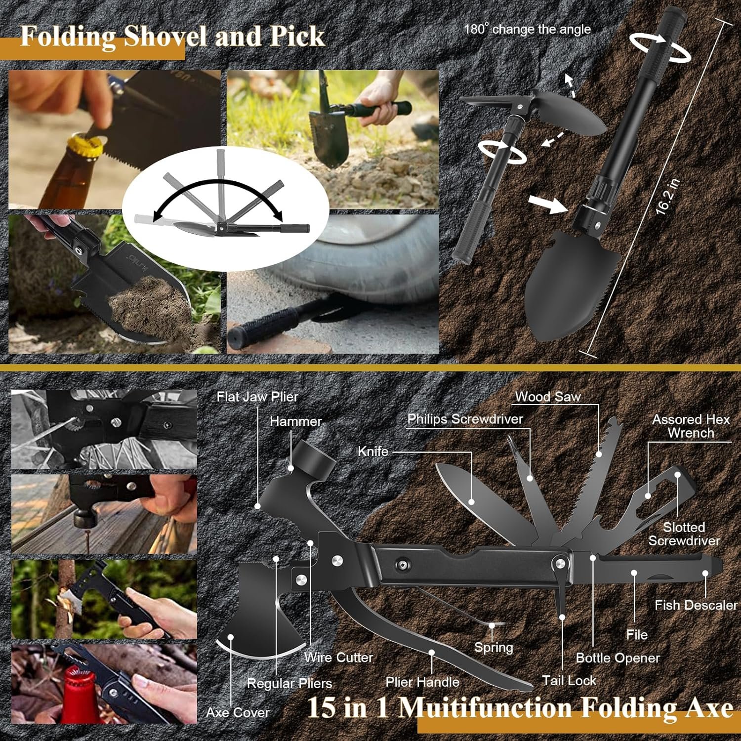 Kit de supervivencia 318 en 1: el kit de emergencia es imprescindible para que cada familia se prepare para algunos eventos imprevistos. Realmente pensamos en tus necesidades y diseñamos este kit de primeros auxilios de supervivencia profesional y práctico, que contiene un total de 318 piezas de equipo y equipo de supervivencia, incluyendo 13 herramientas de supervivencia multiusos y 22 tipos de suministros médicos de emergencia esenciales. Haga que sea fácil para usted manejar las emergencias inesperadas. Equipo y equipo de supervivencia de alta calidad para acampar o necesidades en el hogar: el kit de primeros auxilios de supervivencia ofrece herramientas de supervivencia tácticas profesionales y de alta calidad para garantizar que estarás bien preparado en cualquier emergencia. El kit contiene: hacha 14 en 1, pala plegable y púa, linterna plegable para tienda, linterna táctica, pulsera de supervivencia, tarjeta multiherramienta, iniciador de fuego, manta de emergencia, palo luminoso de 12 horas, sierra de alambre y poncho de lluvia de emergencia. Suministros completos de primeros auxilios para necesidades médicas de emergencia: 305 suministros médicos de emergencia en total están empaquetados en el kit de primeros auxilios. Incluye artículos esenciales como pinzas, tijeras y alfileres, almohadilla, vendaje triangular, máscara de RCP, compresas para quemaduras, bolas de algodón, hisopos de algodón, un generoso suministro de vendajes, toallitas, etc. Perfecto para atender cualquier necesidad médica o de emergencia durante aventuras al aire libre o desastre. Bolsa Molle mejorada, compatible y portátil: los kits de supervivencia tienen una bolsa Molle de alta capacidad que está hecha de nailon 1000D, tamaño de 25,4 cm x 17,0 cm x 11,4 cm. Todo el equipo táctico y los suministros médicos están bien dispuestos en la bolsa Molle, puedes obtener lo que necesitas fácil y rápidamente. Todavía hay espacio para poner algunos artículos que necesita. Es ligero y fácil de llevar, puedes fijarlo a tu chaleco táctico, mochila o cinturón. Adecuado para camping, senderismo, mochileros, viajes y otras actividades al aire libre. Versátil y ampliamente aplicable, ideas de regalo perfectas: este kit de primeros auxilios de supervivencia es adecuado para viajes en automóvil, camping, senderismo, ciclismo, mochileros, así como la vida diaria en el hogar y la oficina. Es un práctico kit de herramientas médicas de supervivencia que todos merecen tener, por lo que es un regalo ideal para hombres, padres, maridos, mujeres, niños. También es un buen regalo para varias fiestas como el día de San Valentín, Navidad, cumpleaños, etc.