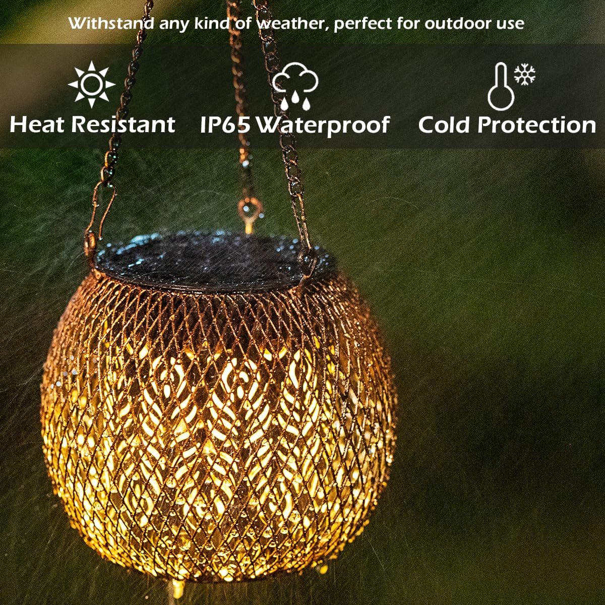 Luces solares para exteriores: las linternas solares utilizan un gran panel solar laminado mejorado, más eficiente y más duradero que las cajas de células solares tradicionales. Deja que las luces LED se carguen rápidamente durante el día y trabajen hasta 10 horas por la noche. (Pilas incluidas) Efecto de iluminación especial: las linternas solares colgantes tienen un diseño de aspecto marroquí y clásico con color marrón. Con la cadena colgante, puedes colgar las luces solares en un gancho o árbol, o en cualquier lugar que quieras decorar. Puede proyectar luces como plumas de pavo real en los terrenos o paredes. Resistente al agua IP65 y duradero: el material de las linternas solares es de metal para garantizar la durabilidad, no se daña fácilmente y no se corroe fácilmente. El nivel impermeable de las luces solares para exteriores alcanza IP65, sin miedo a las altas temperaturas, la lluvia y la nieve. Luces solares de jardín más texturizadas y duraderas para uso al aire libre a largo plazo. Fácil de instalar Sácalo de la caja con facilidad, sin herramientas ni cables. Después de encender los interruptores, simplemente cuelga las linternas solares en cualquier lugar bajo la luz solar directa. Sensor de luz integrado, apagado automático y carga durante el día, se enciende automáticamente al anochecer. La luz solar ideal para exteriores, para patios, jardines, césped, árboles y caminos. Perfecto para luz decorativa de Navidad. Cómo usar Cuando recibas las linternas solares, saca la caja solar y enciende el botón. Luego cubra el panel solar para verificar si la luz está encendida. Cuelga las linternas solares en cualquier lugar bajo la luz solar directa. Por último, cuelga la luz solar exterior en cualquier lugar bajo la luz solar directa para cargar. Soporte al cliente las 24 horas: si tienes alguna pregunta o las luces solares tienen algún problema, no dudes en ponerte en contacto con nosotros por correo electrónico. Haremos todo lo posible para resolver sus problemas.