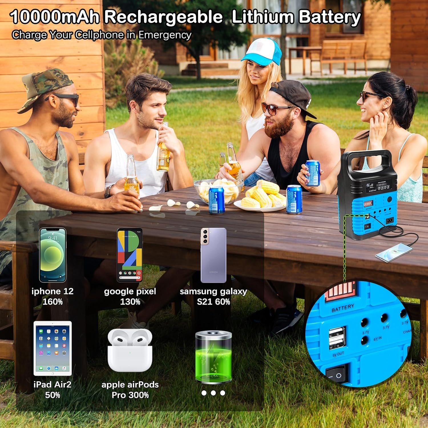 Estación de energía portátil todo en uno: estos generadores portátiles para acampar incluyen una batería de alta capacidad de 10000 mAh y un panel solar de 10 W. Con tecnología de batería avanzada, proporciona energía confiable fuera de la red para camping, caravana, respaldo en casa o cualquier aventura al aire libre, manteniendo tus dispositivos electrónicos cargados y listos. Múltiples opciones de carga: el generador solar con paneles incluidos está diseñado con una versátil gama de tomas: 2 puertos USB (5 VDC), y 3 puertos CC (3.7 VCC). Este pequeño generador te permite conectar múltiples dispositivos como portátiles, teléfonos, ventiladores, libros electrónicos, consolas de juegos, cámaras, MP4 y más simultáneamente. Su alto rendimiento garantiza tiempos de ejecución prolongados para tus dispositivos esenciales. Solar y recargable en pared: este generador de energía ofrece flexibilidad de carga con tres métodos prácticos: recarga a través del panel solar incluido (8-15 horas de carga completa bajo luz solar directa), toma de pared (6-8 horas) o toma de corriente USB para automóvil cuando estás en la carretera. Lleva los generadores al aire libre contigo sobre la marcha y nunca te preocupes por la escasez de energía. (Nota: para una mejor duración de la batería, recarga al menos dos veces por semana si no está en uso, manteniendo un nivel de carga del 60-80%. Evite usarlo únicamente como respaldo de emergencia) Generador de baterías compacto y ligero: con un peso de solo 1.8 libras, este generador portátil para acampar es realmente portátil. Con una construcción duradera, está hecho para soportar los elementos durante todas tus actividades al aire libre. Las características compactas y ligeras permiten que la central eléctrica con panel solar requiera muy poco espacio de almacenamiento, por lo que es perfecto para cualquier persona que desee viajar ligero. Luces brillantes: este mini generador silencioso tiene 3 lámparas LED con interruptor individual y cable de 9.8 ft que aporta luz con bajo consumo de energía (12 horas en 1 lámpara, 9 horas en 2 lámparas, 5 horas en 3 lámparas). Linternas LED integradas con tres niveles de brillo, el banco de energía portátil se puede utilizar como una linterna profesional cuando sea necesario, que es muy adecuado para su uso cuando se rompe el automóvil. S abajo, corte de energía en casa, o una fuente de alimentación de la tienda. Hay modo SOS, utilice la frecuencia internacional SOS para ayuda. Incluye adaptador, batería, enchufe, cable, cable y cable: el paquete viene completo con un adaptador, una batería de alta calidad, enchufes necesarios, cables y cables para garantizar que tengas todo lo que necesitas para un funcionamiento sin problemas nada más sacarlo de la caja.