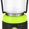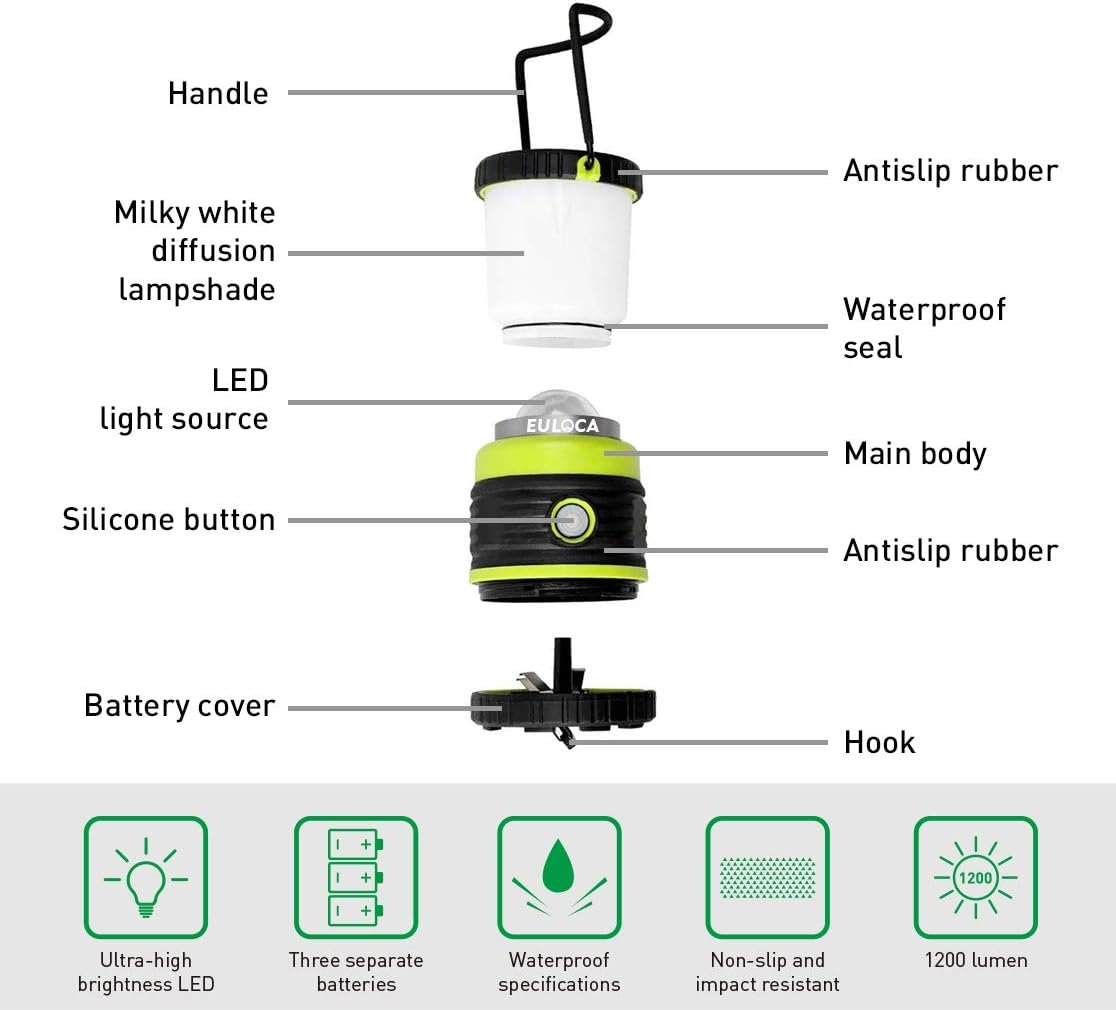 Brillo mejorado: el brillo más alto es de hasta 1200 lm, y tiene un ángulo de haz de 360 grados, lo que le proporciona suficiente brillo. Hecho de carcasa de panel de rayas, emite la luz uniformemente sin deslumbrar. No solo obtienes un brillante máximo de 1200 lúmenes, sino que también obtienes una luz totalmente regulable controlada simplemente pulsando el botón de encendido. Increíble durabilidad La linterna de camping EULOCA con la base moldeada de goma y plástico está diseñada para una mejor estabilidad en superficies resbaladizas, irregulares y para una mejor resistencia al agua. 4 modos de iluminación : linterna LED regulable con 4 modos, puedes ajustar desde 6000 K/800 lm (luz blanca de día), 3000 K/400 lm (blanco cálido), 1200 lm (luz blanca de día + blanco cálido) a 1000 lm (modo flash) SOS intermitente. Regulable: pulsa y mantén pulsado el botón para atenuar la luz. Tiempo de trabajo excepcional: utiliza 3 pilas D de 1,5 V (no incluidas) como fuente de alimentación, permite que se pueda utilizar hasta 12-25 horas, que duran más que la mayoría de las lámparas de campamento en el mercado. Rendimiento extraordinario para corte de energía, uso de emergencia y huracanes, etc.
