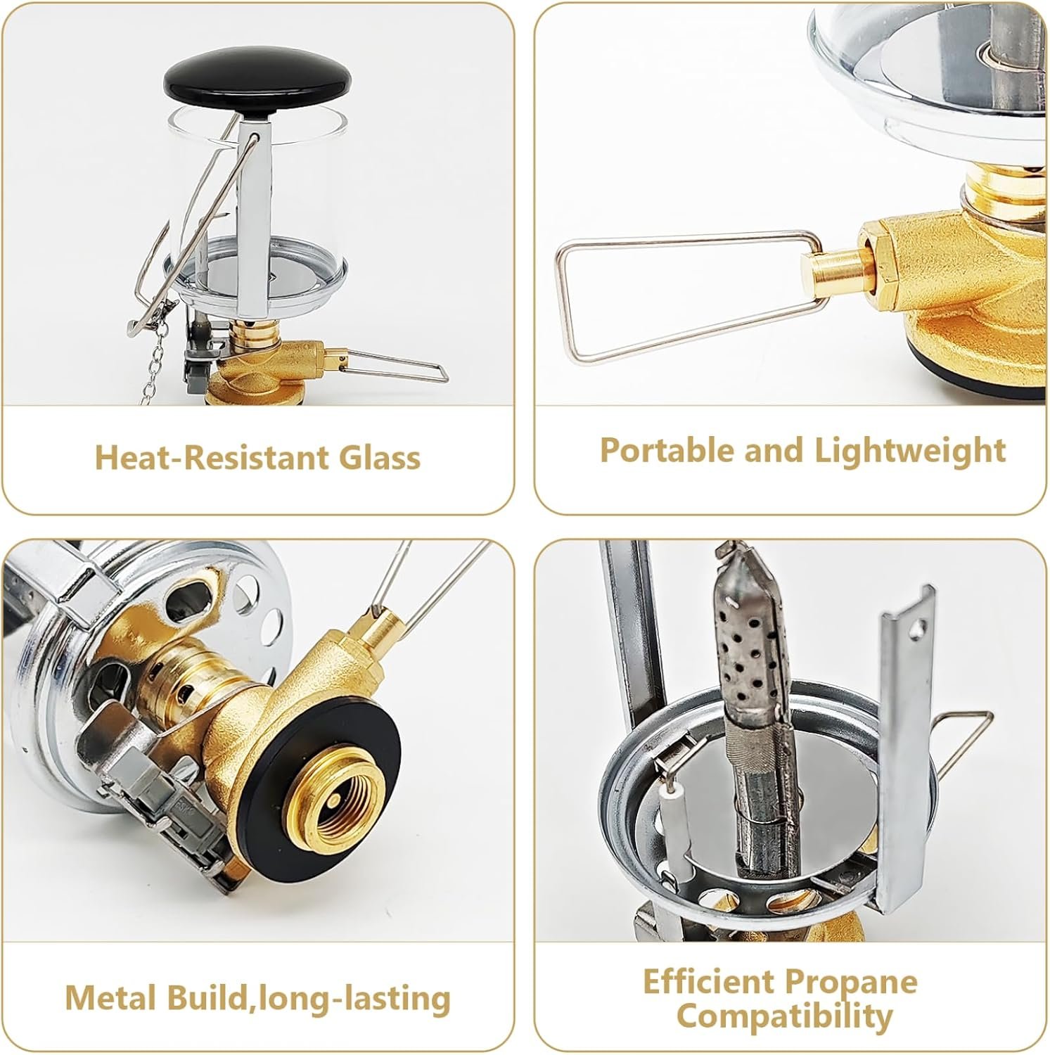 Construcción de metal: esta linterna de gas cuenta con una robusta construcción metálica compacta combinada con vidrio resistente al calor, lo que garantiza una durabilidad duradera y seguridad durante el uso al aire libre Vidrio resistente al calor: el escudo de vidrio resistente al calor de alta calidad mejora la seguridad al evitar el sobrecalentamiento al tiempo que garantiza una salida de luz clara y consistente en diversas condiciones climáticas Portátil y ligero: diseñada para un fácil transporte, esta lámpara de vela portátil encaja perfectamente en su equipo de campamento o senderismo, proporcionando una luz confiable sin agregar volumen Compatibilidad eficiente de propano compatible: compatible con tanques de propano estándar (tanque no incluido), esta linterna ofrece iluminación brillante y constante, ideal para camping, senderismo o uso de emergencia Iluminación exterior versátil: perfecta para viajes de campamento, aventuras de senderismo o uso en el patio trasero, esta linterna de gas aporta una fuente de luz confiable que combina la estética tradicional de estilo de vela con eficiencia moderna de propano