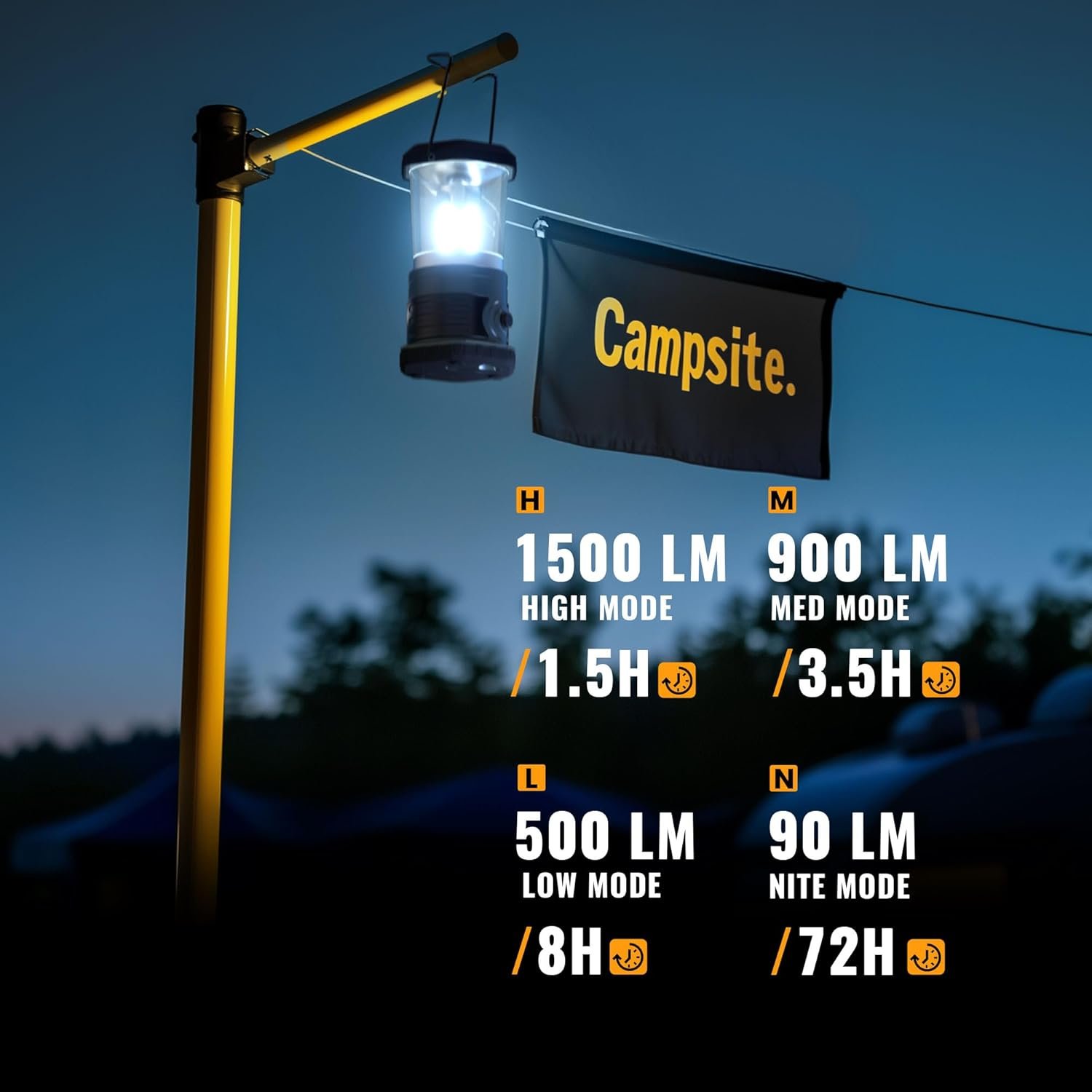 Brillo y batería incluida: esta linterna LED de campamento ofrece hasta 1500 lúmenes de brillo alimentado por 4 pilas D (incluidas), proporcionando una potente iluminación de 360° para tiendas de campaña, uso de luz nocturna o como una linterna confiable para cortes de energía durante tormentas, huracanes o emergencias 4 modos de luz personalizables para cualquier ocasión: pulsa el interruptor para ajustar de alto 1500 lm, med-900 lm, bajo 500 lm a nite-90 lm, por lo que es ideal para leer, iluminación de dormitorio, uso junto a la cama, o como una luz de tienda de campaña para viajes de fin de semana, actividades de tropas exploradoras o aventuras nocturnas Potencia fiable para emergencias: construida para cortes de energía prolongados, esta linterna funciona con 4 baterías D (incluidas) para 1.5 a 75 horas de luz. A diferencia de las luces recargables que fallan cuando la electricidad está apagada, esta linterna sigue funcionando, simplemente cambia las baterías por energía instantánea. Imprescindible para la temporada de huracanes, tormentas de invierno y seguridad en carretera. Durabilidad IPX4 para todo tipo de clima para uso en exteriores: la linterna COB de 1500 lúmenes con iluminación de 360° es perfecta para iluminar tu ático, granero, granja o patio trasero, y puede soportar la lluvia, la nieve y el uso al aire libre duro, por lo que es una opción confiable para viajes al aire libre, cenas de fogata o reuniones de patio Fácil de transportar y diseño versátil para colgar: nuestra linterna portátil funciona con pilas cuenta con un asa integrada en la parte superior para llevar y un gancho empotrado en la parte inferior para colgar faroles, ideal para colgar boca abajo dentro de tiendas de campaña, cobertizos, áreas de alimentación o espacios de arrastre. Es la solución versátil de linterna LED para iluminación interior y aventuras al aire libre