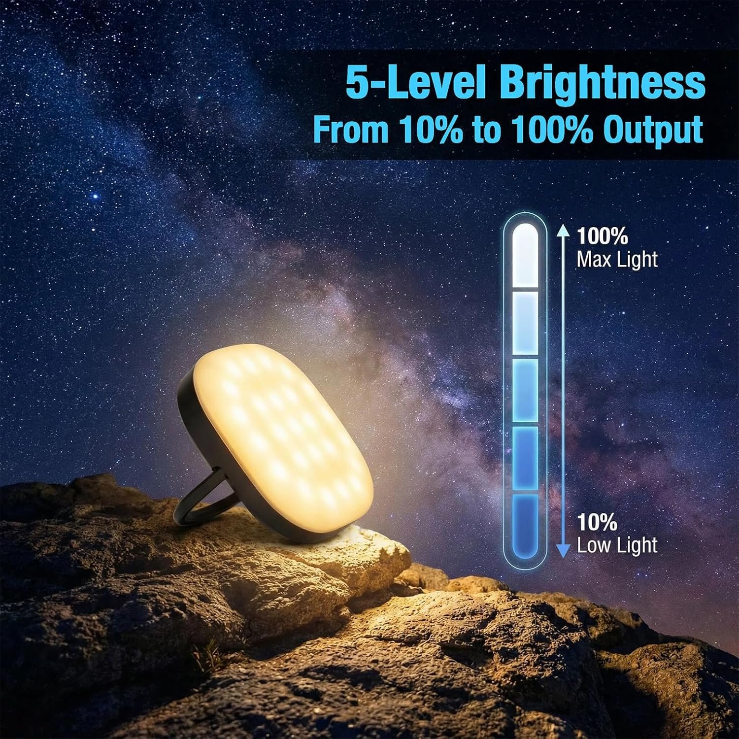 5000mAh/3.85V/19.25WH Luz LED recargable por USB para actividades al aire libre, utiliza baterías de iones de litio de polímero de litio de tamaño pequeño, peso ligero, de alta energía, segura y confiable, fácil de llevar al exterior. Carga solar/cuatro niveles de indicador de batería: equipado con panel de carga solar de silicona monocristalina de 1 W, puede reponer la energía de tu teléfono celular durante actividades al aire libre y emergencias. Cuatro luces indicadoras de encendido, simple y claro. Cambio de cuatro colores/ráfaga de luz roja Luz blanca, luz cálida, luz natural, luz roja, cambio de cuatro colores, aplicable a una variedad de actividades al aire libre, camping, barbacoa, brillo de 5 etapas se puede ajustar, el flash de ráfaga de luz roja se puede utilizar en situaciones de emergencia. Iluminación continua de 2000 lúmenes/6H+ El brillo más alto de esta luz LED es de 2000 lúmenes, el brillo más alto puede ser un tiempo de iluminación continua de más de 6 horas, el brillo más bajo puede ser iluminación continua de más de 50 horas, para que tus actividades al aire libre proporcionen un tiempo de iluminación prolongado. IP65/mango oculto: luces LED con ip65 impermeable y resistente al polvo, resistencia a los impactos, viene con mango portátil, se puede desmontar para sostener, senderismo al aire libre, campamento, pesca, alivio de desastres de emergencia, una variedad de entornos para usar.