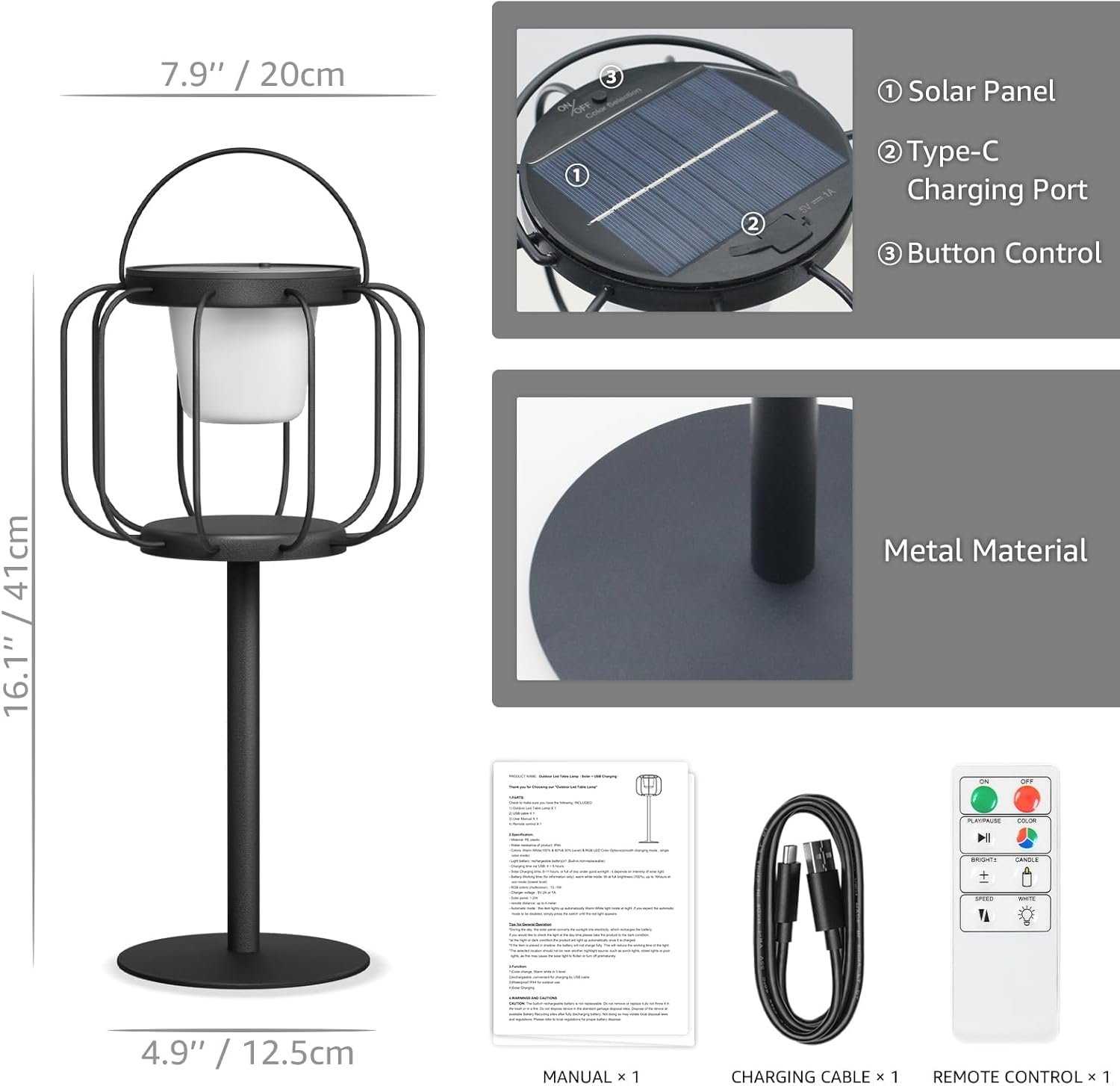 Ilumina tu mundo con versatilidad alimentada por energía solar: lámpara de mesa solar inalámbrica – Control remoto, iluminación blanca cálida regulable y RGB | Diseño de metal | 40,6 cm de altura | Adecuado para jardines, patios, camping y espacios interiores/exteriores Ambiente elegante, en cualquier lugar: eleva tu hogar o espacios al aire libre con esta elegante lámpara solar de metal, mezclando el encanto de las velas electrónicas parpadeantes con un brillo ambiental personalizable. Adecuado para jardines, patios, comedores o eventos al aire libre, transforma entornos ordinarios en encantadores retiros. Innovación ecológica: ¡Aprovecha el poder del sol! El panel solar integrado carga la lámpara durante el día, mientras que los LED de bajo consumo ofrecen hasta 10 horas de iluminación suave por la noche. Para días nublados, recargue sin esfuerzo a través de USB: la sostenibilidad se une a la comodidad. Lámpara de mesa solar: ajusta el brillo, cambia entre blanco cálido y 16 tonos RGB vibrantes, o establece modos dinámicos, todo desde hasta 26 pies de distancia con el controlador incluido. Adecuado para relajarse junto a la piscina o para ajustar el ambiente de tu patio trasero sin salir de la silla. Configuración sin complicaciones, ambiente instantáneo: sin herramientas, sin cableado, sin estrés. Colócalo en una mesa, móntalo en un gancho o déjalo reposar solo: esta lámpara resistente a la intemperie se adapta a tu espacio en cuestión de segundos. S