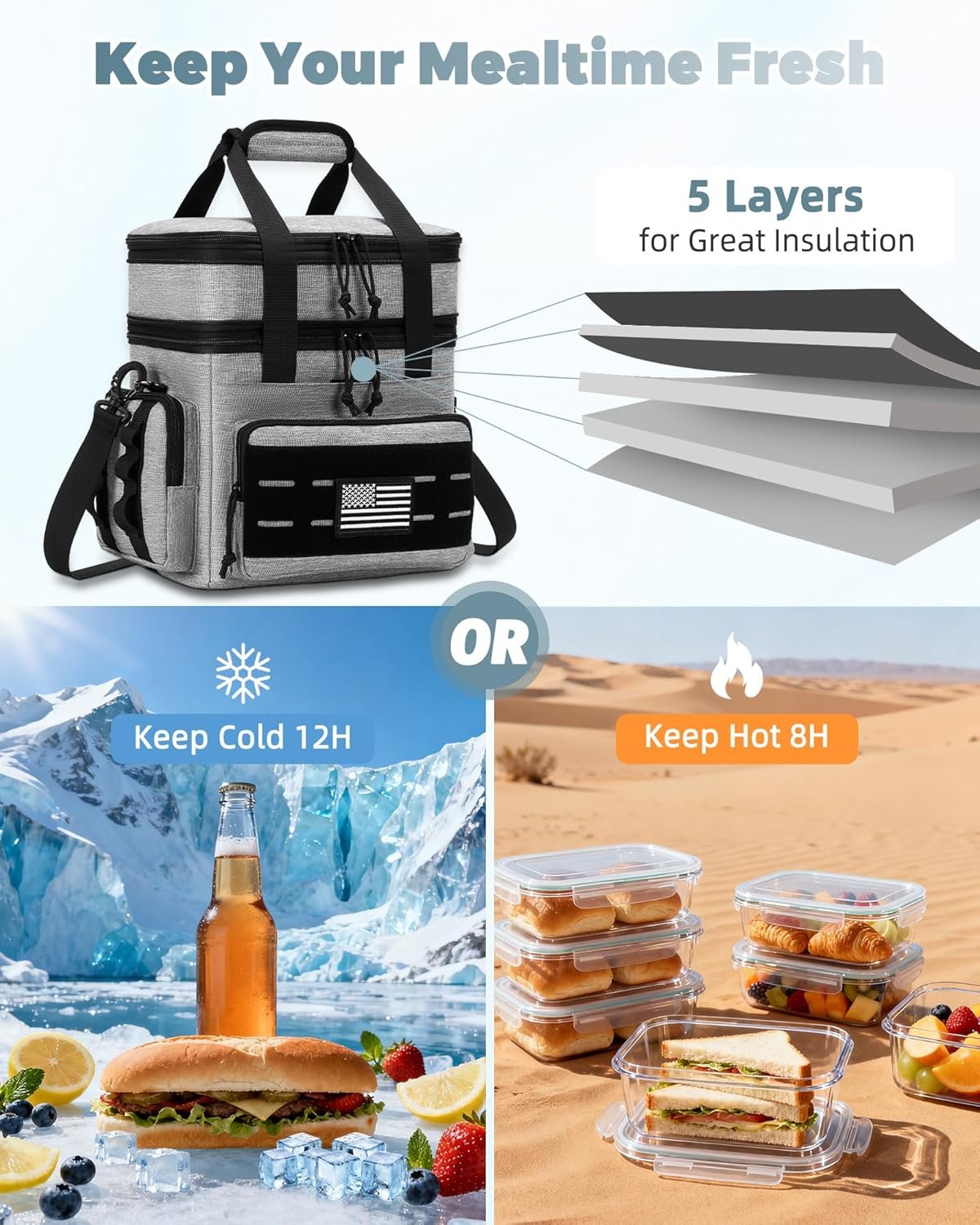 Características especiales: A prueba de fugas, Bolsa de almuerzo aislada, Doble cubierta, Fiambrera grande, Molle táctico