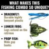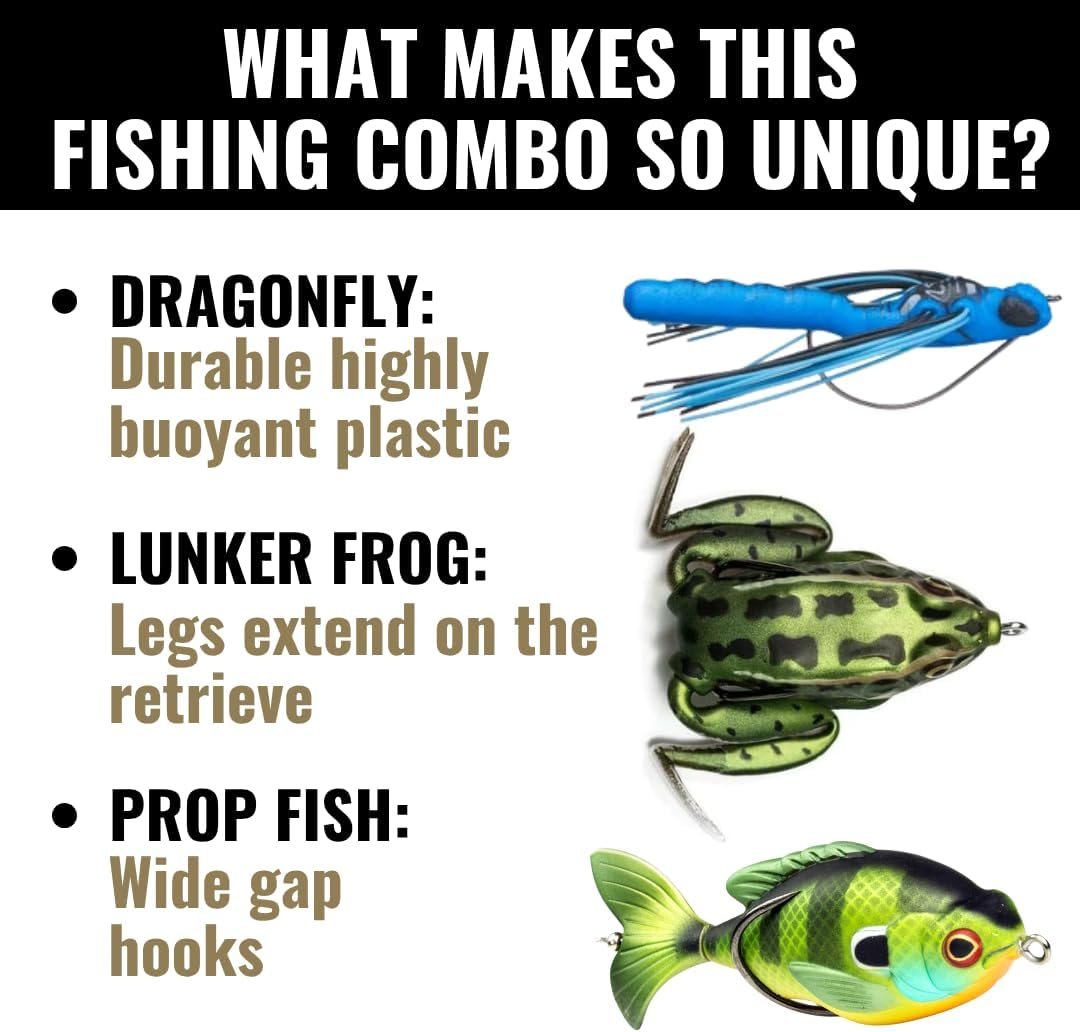 Libélula: señuelo finura de agua superior; Plástico duradero altamente flotante; Ecels cuando se pesca sin malezas; ala de 5,1 cm, cuerpo de 7,6 cm, peso de 1/4 oz Lunker Frog: Las piernas se extienden en la recuperación; Las piernas se retraen y el cuerpo cae en la pausa; Construcción suave del cuerpo hueco; Diseño sin malezas; Longitud 4,4 cm, peso de 1/4 oz Prop Fish: un solo soporte ruidoso; diseño sin malezas; ganchos de gran brecha; gran acción de topwater; longitud 8,3 cm, peso de 1/2 oz