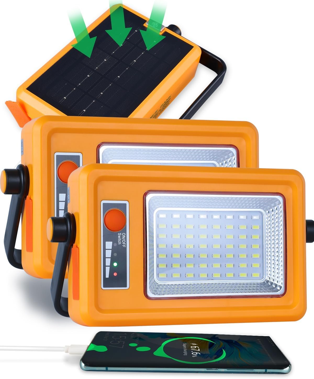 Luz de trabajo LED súper brillante: cada reflector LED de 50 W tiene 56 luces LED más ligeras de alta calidad, lo que le brinda un brillo súper alto, la noche es tan brillante como el día. Las luces LED de inundación se cambian entre 4 modos pulsando brevemente el botón de encendido: alto, medio, bajo, azul y rojo intermitente puede adaptarse a cualquier situación. Su tamaño compacto (18,3 cm x 4,0 cm x 10,8 cm) incluye base magnética y soporte resistente, proporcionando múltiples opciones de colocación: de mano, colgante o de escritorio. Excelente disipación de calor y uso del banco de energía: Los paneles solares gruesos garantizan una rápida disipación de calor incluso en verano. El silicio monocristalino mejorado y los paneles solares aumentados proporcionan una carga solar más rápida hasta un 20%. Además de su función principal como luz de trabajo, esta luz de trabajo recargable también puede servir como una fuente de alimentación móvil, 6000 mAh, lo que te permite cargar otros dispositivos electrónicos mientras estás en movimiento. Fuerte uso magnético: diferente de 0.079 in, después de 12000 veces la prueba, la base magnética de 0.197 in lo convierte en una opción ideal para el trabajo automotriz, el trabajo bajo el capó o cualquier aplicación que requiera iluminación manos libres. La portabilidad y versatilidad de nuestra luz de trabajo magnética la hacen muy adecuada para acampar, pescar, mantener y mucho más. Consejos: el acero al carbono no es magnético, el hierro y el acero regular son magnéticos Estructura duradera del ABS: Nuestra luz del sitio de trabajo está hecha de vidrio resistente y material ABS, capaz de soportar duras condiciones al aire libre. Su clasificación impermeable garantiza un rendimiento confiable, independientemente del viento o la lluvia. Perfecto para almacenes, garajes, jardines, camping, pesca, senderismo, etc. Impermeable: la luz de inundación portátil para exteriores está sellada con una gran cantidad de pegamento impermeable, y cada luz ha sido probada para impermeabilizar para garantizar que cumple con los estándares de impermeabilidad. Permite que la lámpara funcione normalmente en lluvia y nieve, alta temperatura o ambiente frío. Tenga cuidado de no exponer el tapón al agua de lluvia.