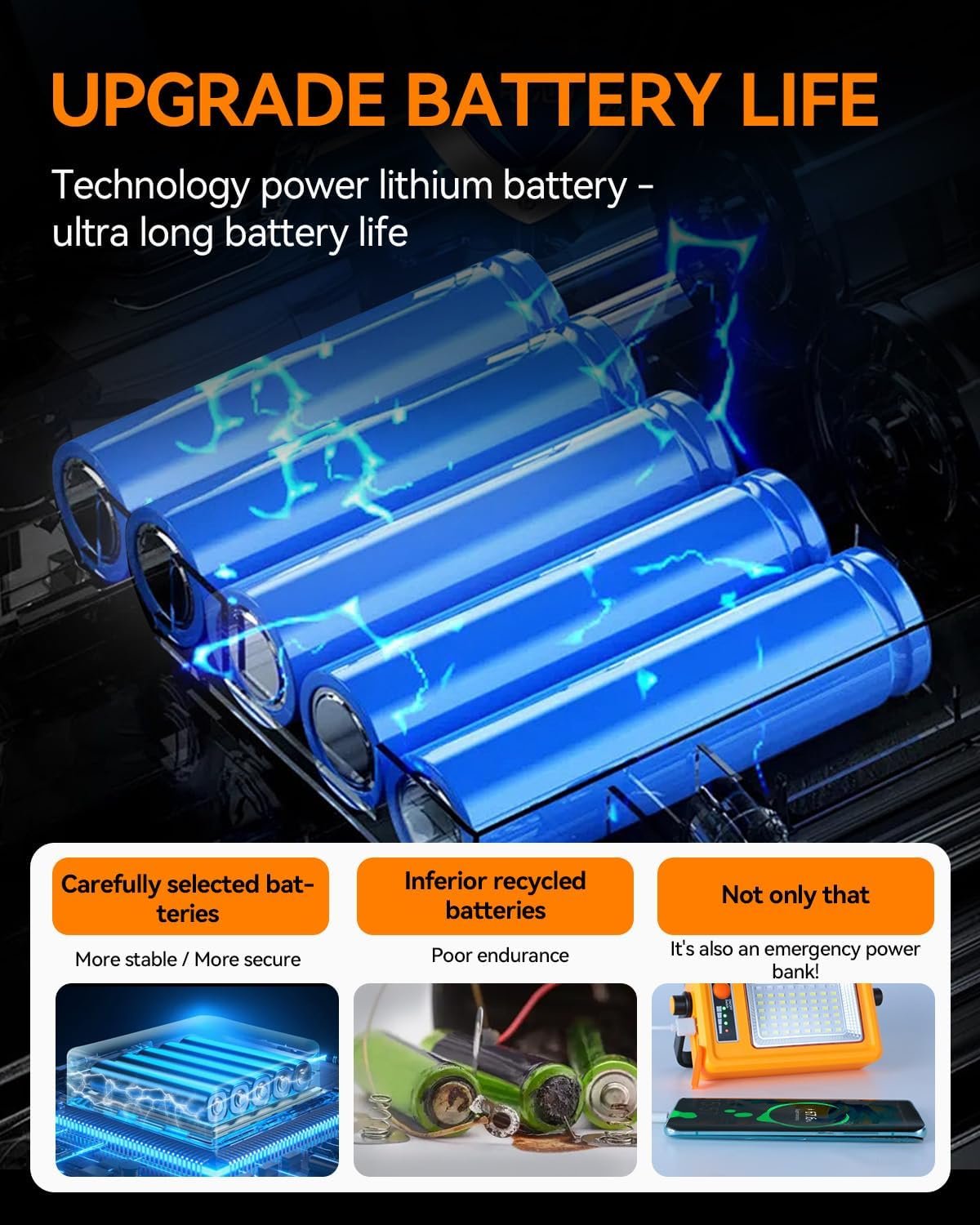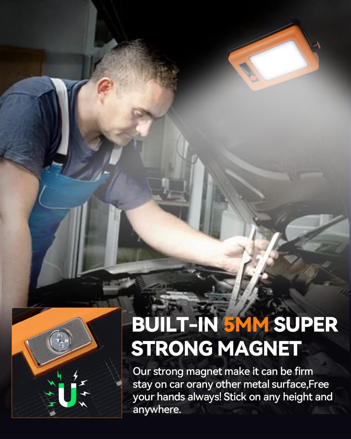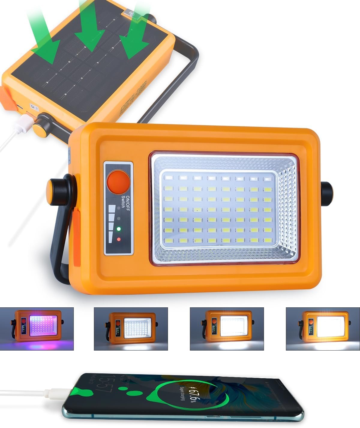 Lúmenes altos ultrabrillantes Esta luz solar recargable de trabajo cuenta con 56 cuentas LED de gran tamaño de alta calidad que ofrecen un brillo excepcional. Cambia sin esfuerzo entre cuatro modos: alto para máxima visibilidad, medio para trabajo estándar, bajo para uso prolongado y rojo azul estroboscópico para situaciones de emergencia. Construido para adaptarse a sitios de construcción, campings y emergencias en carretera por igual Batería de larga duración: alimentada por una enorme batería integrada de 5990 mAh, esta luz de trabajo LED portátil proporciona de 8 a 12 horas de iluminación continua con una sola carga. El indicador inteligente de 4 niveles (100%, 70%, 50%, 25%) muestra el estado de energía en tiempo real, eliminando conjeturas y asegurando que se recargue antes del agotamiento. Perfecto para proyectos durante todo el día y actividades al aire libre durante la noche Tres funciones inteligentes en una: más que una luz de trabajo, es una herramienta de emergencia versátil. Utilice la salida de alimentación USB para cargar teléfonos y dispositivos, aprovechar la conversión solar de alta eficiencia del 20% para la carga fuera de la red o confíe en su iluminación regular confiable. Una verdadera solución todo en uno para mantenerse iluminado y conectado en cualquier lugar Diseño práctico e impermeable: el soporte giratorio de 180° y la base magnética fuerte proporcionan un funcionamiento manos libres en varias posiciones. A diferencia de las luces estándar, cuélgala, móntala o colócala en terrenos irregulares con facilidad. La construcción impermeable garantiza un rendimiento confiable en condiciones de lluvia, salpicaduras y humedad Amplio uso y opción de regalo perfecta: esencial para camping, pesca nocturna, reparaciones de automóviles, cortes de energía y proyectos de bricolaje. Su portabilidad robusta y multifuncional lo convierten en un regalo ideal que ofrece un valor práctico y una sorpresa pensada para los entusiastas del aire libre, los manitas y cualquier persona que ama estar preparada