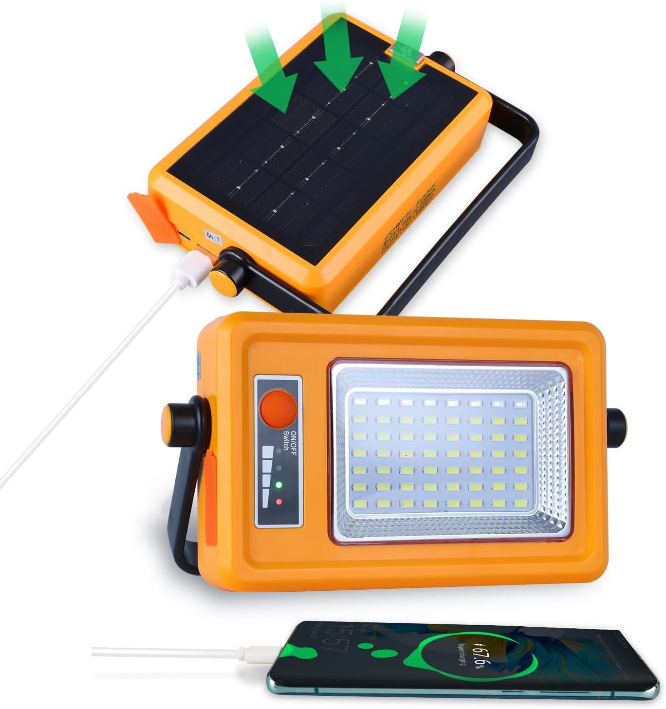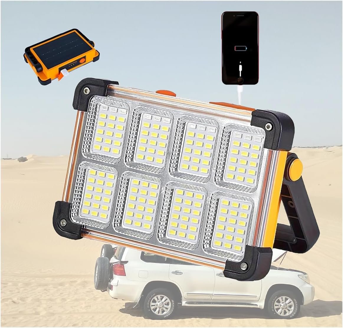 Luz de trabajo recargable solar: ¡Potencia tus proyectos de forma sostenible con esta luz solar de trabajo de 100 W! Equipado con un panel solar de alta eficiencia, se recarga rápidamente bajo la luz solar, ideal para camping, senderismo o emergencias. La batería de 2600 mAh ofrece de 8 a 12 horas de tiempo de funcionamiento, mientras que el puerto USB-C permite la carga dual (solar/USB). Nunca te preocupes por cortes de energía: ¡ecológico y confiable! Transporte portátil al aire libre: diseñada para uso en movimiento, esta luz compacta y ligera cuenta con un asa plegable y un gancho para colgar o transportar fácilmente. Perfecto para reparaciones bajo el capó, sitios de trabajo o viajes de mochilero. Cabe en maleteros de coche o mochilas sin esfuerzo. Lleva una iluminación brillante y sin cables a cualquier lugar: llueva o haga sol Cuerpo ABS duradero: construido para durar con material ABS a prueba de golpes, esta luz de trabajo soporta caídas, impactos y condiciones duras. El diseño resistente al calor evita el sobrecalentamiento incluso durante un uso prolongado. Resistente pero ligero, es imprescindible para contratistas, campistas y aficionados al bricolaje que necesitan equipo resistente. Luz de inundación LED de 8000LM: Las bombillas LED superbrillantes de 8000 lúmenes ofrecen una iluminación de gran angular, similar a la luz del día, cubriendo hasta 100 . Los modos de brillo ajustables (100%/50%/SOS) se adaptan a tareas desde iluminación de tienda de campaña hasta señalización de emergencia. Las opciones de color RGB añaden versatilidad para la iluminación ambiental o las alertas de seguridad. Resistente al agua IP66: diseñada para todo tipo de clima, la carcasa con clasificación IP66 resiste la lluvia intensa, el polvo y el barro. Utilízalo con confianza en tormentas, sitios de construcción o aventuras todoterreno. El circuito sellado garantiza la seguridad, mientras que la base antideslizante lo mantiene estable en superficies húmedas. ¡Durabilidad lista para la aventura!