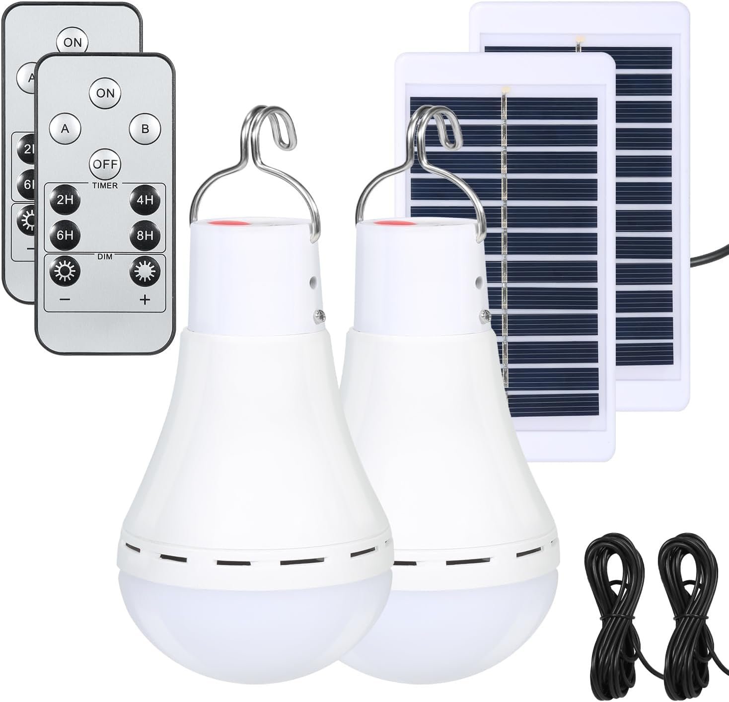 Función de sincronización automática: 4 modos de iluminación: la duración de sincronización correspondiente al brillo es: alto brillo – 2 horas, brillo medio – 4 horas, bajo brillo – 6 horas, SOS – 8 horas. Esta bombilla regulable tiene cuatro niveles de brillo, que van desde 250 lúmenes a 350 lúmenes por bombilla. Después de estar completamente cargada, puede funcionar continuamente durante 5 a 10 horas (el brillo y la intensidad de la luz de la bombilla afectarán cuánto tiempo funciona). Bombilla solar que se adapta a cualquier lugar: esta bombilla solar para exteriores utiliza energía limpia, lo que puede ahorrar mucha electricidad al año y contribuir a la protección del medio ambiente mundial. Es perfecto para áreas sin electricidad, como cobertizos, gallineros o garajes, y puede iluminar un área de alrededor de 100 pies cuadrados con una sola bombilla. Resistente al agua IP65/44: el panel solar tiene una alta calificación de impermeabilidad, no requiere atención adicional durante el uso. Sin embargo, la bombilla en sí tiene una calificación de impermeabilidad relativamente más baja. Recomendamos tomar precauciones para proteger la bombilla del agua cuando esté en uso. Se pueden cargar fácilmente a través del panel solar (exterior) o un cable de carga Android (en interiores). Juego de temporizador: utilizando el control remoto, puedes elegir entre 4 ajustes de temporizador: 30 minutos, 2 horas, 5 horas y 10 horas. La bombilla se apagará automáticamente después del período de tiempo elegido. Antes de usar, carga la bombilla solar. La distancia de control por control remoto es de 3.3-13.1 ft. Satisfacción garantizada: disfruta de devoluciones gratuitas en un plazo de 45 días y recibe reemplazos gratuitos por problemas de calidad en un plazo de dos años. Compre con confianza de un artesano profesional de equipos solares con más de una década de experiencia.