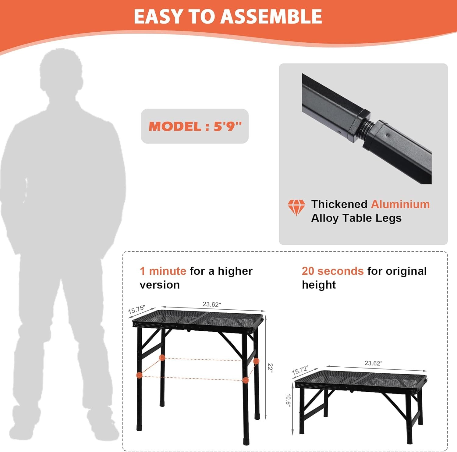 Construcción de metal resistente: la mesa de camping está hecha de escritorio de malla de hierro y marco de aleación de aluminio. Las patas de mesa de tubo de aleación de aluminio engrosadas hexagonales tienen un área de soporte de peso más grande. Soporta hasta 90 libras. Altura ajustable: la altura se puede ajustar para adaptarse a necesidades específicas, desde una altura de 26,9 cm a 55,9 cm simplemente atornillando las patas de extensión que se incrustan debajo del escritorio. Fácil de instalar y plegar: nuestra mesa plegable es fácil y rápida de instalar y plegar sin herramientas adicionales. El tamaño desplegado es de 60,0 cm x 40,0 cm, proporciona un montón de espacio. Ligero y portátil: el tamaño plegado es de 40,0 cmx 30,0 cm x 6,5 cm y pesa solo 4.85 libras, es compacto y fácil de almacenar y transportar en un RV. Perfecto para usar como mesa de parrilla mientras acampas, viajes y picnic. Fácil de limpiar: la parte superior de esta mesa plegable cuenta con un diseño de malla de hierro que resiste el calor, el agua y el óxido. Permite que los derrames y migas pasen para una fácil limpieza y mantenimiento.