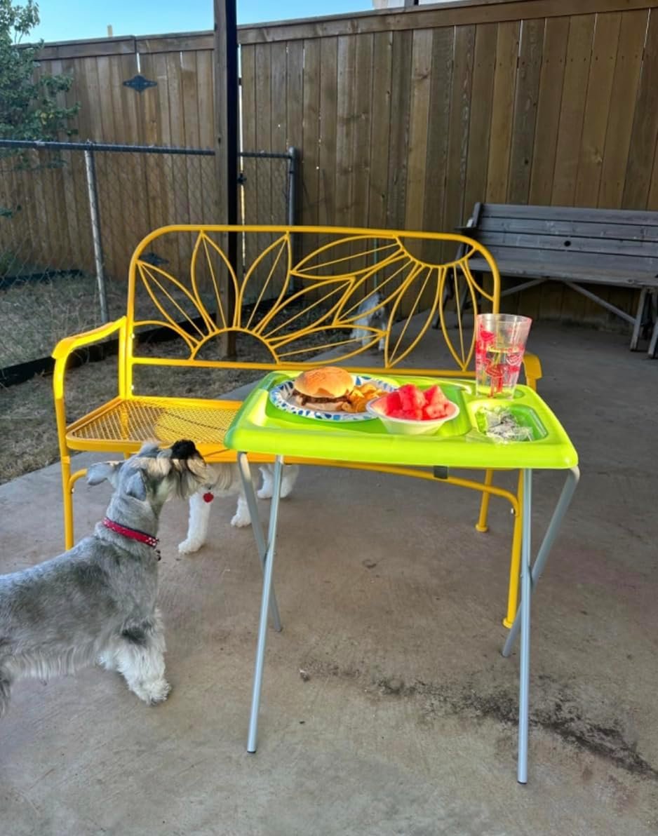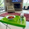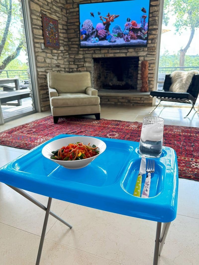 Bandeja de TV para interiores que ahorra espacio: se pliega y se puede utilizar para el sofá comedor frente a la televisión, o como una pequeña computadora portátil o mesa de escritura, incluso como una tarjeta o mesa de juego Mesa Glamping portátil al aire libre: perfecta para cenar al aire libre, incluyendo camping, festivales de música, portón trasero, viajes por carretera o simplemente diversión gastronómica en el patio trasero. Solo pesa 6 libras cada una Cómodo de usar: las patas caben fácilmente debajo de la mesa mientras trabajas o comes. Las patas de metal están separadas y en los lados, proporcionando un amplio espacio para que las patas quepan debajo de la mesa de la bandeja Fuerte y ligero: sin montaje, las patas de acero tubular de alta resistencia están firmemente conectadas con la bisagra central para plegarse o abrir. La parte superior colorida se ajusta fácilmente en su lugar Cena de TV retro diseñada con colores vibrantes. La parte superior de polipropileno muy duradera es fácil de limpiar y difícil de romper. Gran mesa de arte para niños.