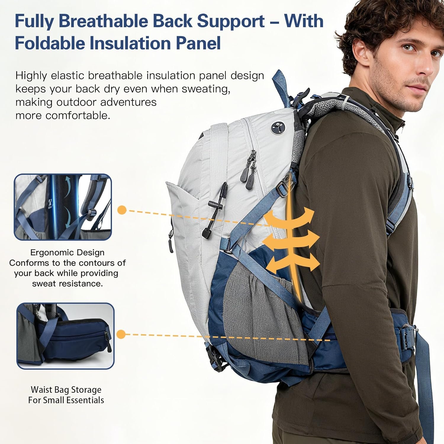 Diseño de panel trasero plegable: esta mochila de senderismo incorpora un panel trasero sensible y transpirable que absorbe el sudor. Esto evita que tu espalda se empape de sudor durante largas caminatas, ofreciendo una experiencia de transporte significativamente más cómoda. Tela premium e impermeable: esta mochila de senderismo impermeable de gran capacidad está hecha de tela resistente al desgarro de primera calidad que resiste arañazos y resiste el desgaste. El bolsillo inferior de la mochila de senderismo cuenta con una bolsa adicional impermeable para la lluvia, por lo que no tienes que preocuparte por que el agua de lluvia se filtre en tu mochila y exponga tus objetos de valor a aguaceros. Diseño ergonómico: esta mochila de camping para hombre cuenta con correas ergonómicas para los hombros y un panel trasero acolchado. Las correas de compresión ajustables en ambos lados y la parte inferior permiten apretar el paquete de mochilero. Proporciona una excelente comodidad y apoyo, reduciendo la fatiga durante largas caminatas. Mochila de gran capacidad con múltiples compartimentos: nuestra mochila cuenta con múltiples bolsillos para un almacenamiento organizado. El compartimento principal de la mochila ligera ofrece un amplio espacio, completo con un compartimento dedicado para zapatos y seis bolsillos externos para una organización sin esfuerzo del equipo. Abundantes correas de compresión y puntos de fijación soportan configuraciones externas personalizables, lo que permite un fácil transporte de sacos de dormir, tiendas de campaña, bastones de senderismo, pioletas de hielo y otros equipos. Mochila de senderismo ligera para un viaje fácil: esta mochila de senderismo de 40 litros pesa solo 2.5 libras, perfecta para viajes cortos y aventuras al aire libre. Su diseño unisex cumple con la mayoría de los requisitos de tamaño de aerolíneas. Esta mochila de camping funciona como una mochila de senderismo, bolsa de viaje y bolsa de negocios, un compañero esencial para cualquier viaje.