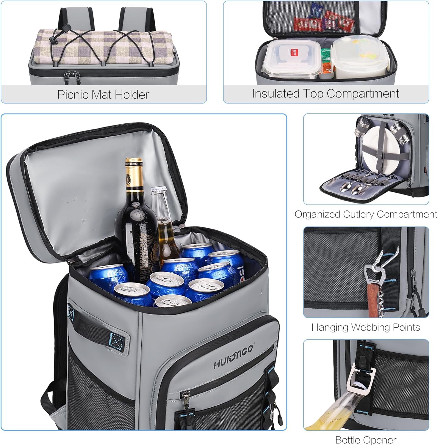 poliéster Importado Excepcional retención de calor: la mochila enfriadora Hulongo está diseñada para mantener tus bebidas y alimentos frescos hasta 12 horas con su aislamiento de espuma gruesa de 0.315 in y su avanzado sello de PEVA plateado. Ya sea que vayas a la playa, vayas de picnic, senderismo, campamento, compras de comestibles, esta mochila garantizará que tus artículos se mantengan a la temperatura adecuada durante todo el día Resistente al agua y ligero: Hecho de material de nailon resistente a los arañazos de alta densidad con un revestimiento de PU adicional, nuestras bolsas de refrigeración son 100% impermeables y fáciles de limpiar. Además, su diseño ligero y correas acolchadas ajustables hacen que sea más cómodo de llevar, eliminando la molestia de llevar una hielera tradicional pesada Múltiples compartimentos y bolsillos: la mochila hielera cuenta con dos compartimentos aislados para mantener tus bebidas frescas y tu comida seca. Además, cuenta con un bolsillo frontal grande y dos bolsillos laterales, lo que te permite guardar tus aperitivos, teléfono, cartera y otros accesorios cómodamente. Además, proporcionamos un abridor de botellas para mayor comodidad A prueba de fugas y sin sudor: nuestra mochila enfriadora utiliza un proceso de prensado en caliente sin costuras de alta tecnología, lo que la hace completamente a prueba de fugas. Además, las cremalleras horizontales suaves adicionales mejoran sus propiedades antifugas Capacidad espaciosa: con dimensiones que miden 45,0 cmx31,0 cmx20,1 cm (H x L x W), nuestra mochila enfriadora puede acomodar hasta 35 latas (11.2 fl oz). Ofrece suficiente espacio para empacar comidas, bebidas altas, aperitivos y otros artículos necesarios. Es un regalo perfecto tanto para hombres como para mujeres debido a su gran capacidad y versatilidad