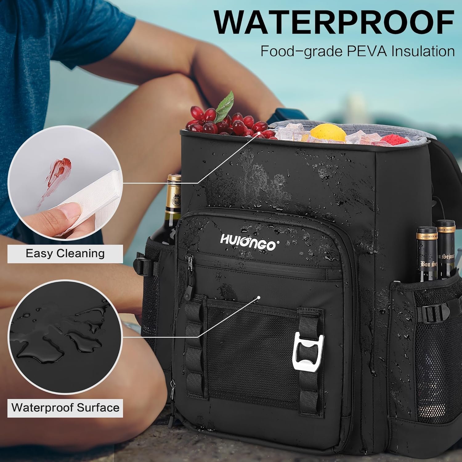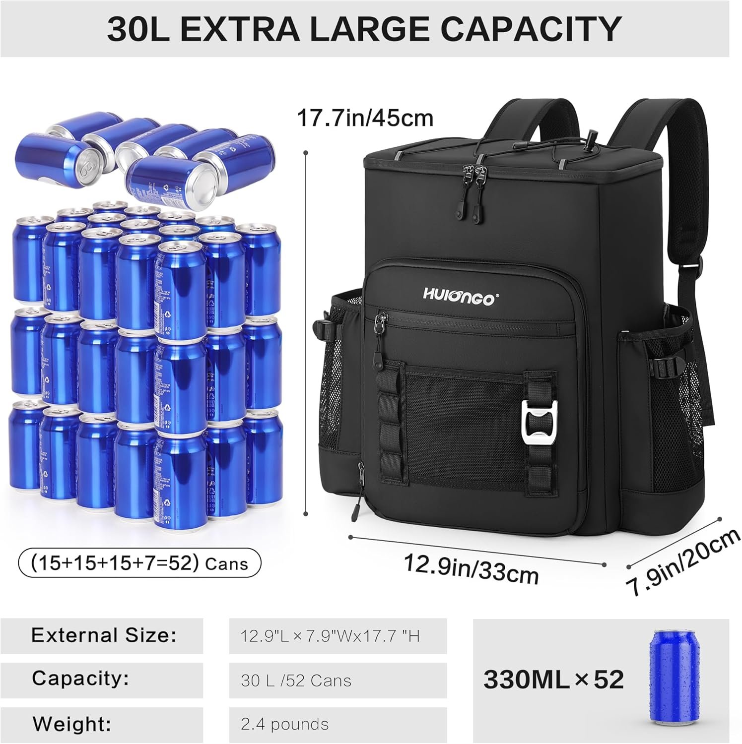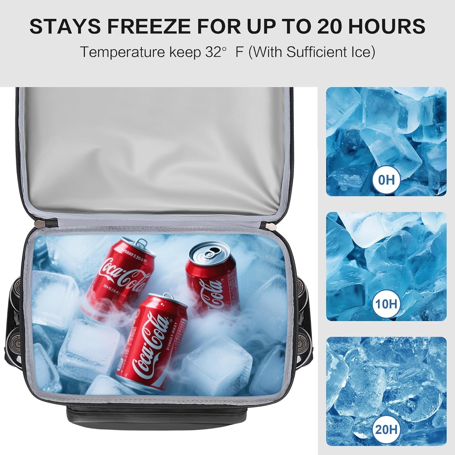 Diseño de alta capacidad para 52 latas: esta mochila hielera cuenta con un espacioso interior de 45,0 cm x 32,8 cm x 20,1 cm que tiene capacidad para 52 latas (11.2 fl oz) + recipientes de comida; el cordón elástico superior asegura equipo adicional como chaquetas o mantas de picnic para salidas versátiles. Sistema de organización de múltiples bolsillos: bolsillo frontal aislado para cubiertos para utensilios; redes de malla laterales dobles para botellas de agua + bolsa frontal de acceso rápido para llaves/cartera; un abridor de botellas integrado para mayor facilidad. Protección resistente al agua y resistente: fabricado con tela de poliéster duradera y repelente al agua con un acabado protector. El forro de PEVA sin costuras es completamente a prueba de fugas, protegiendo tu equipo y la mochila de derrames en el interior y la humedad en el exterior. Las cremalleras de sellado suave mejoran la barrera impermeable. Control de temperatura extendido de 20 horas: aislamiento de espuma gruesa de 0.315 in con forro de PEVA plateado que mantiene las temperaturas ideales durante más de 20 horas; rigurosamente probado para mantener el contenido frío durante viajes a la playa, caminatas o carreras de comestibles Limpieza rápida y transporte cómodo: sus materiales robustos hacen que la limpieza sea sencilla. El diseño aerodinámico y ligero de esta hielera de mochila, combinado con correas ajustables y acolchadas para los hombros, ofrece una suspensión centrada en la comodidad, sin necesidad de marcos voluminosos ni acolchado. Lleva fácilmente peso sustancial sin tensión.
