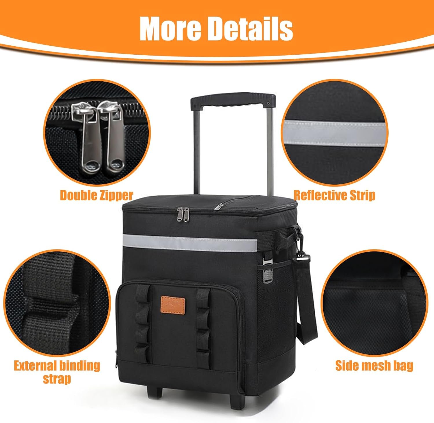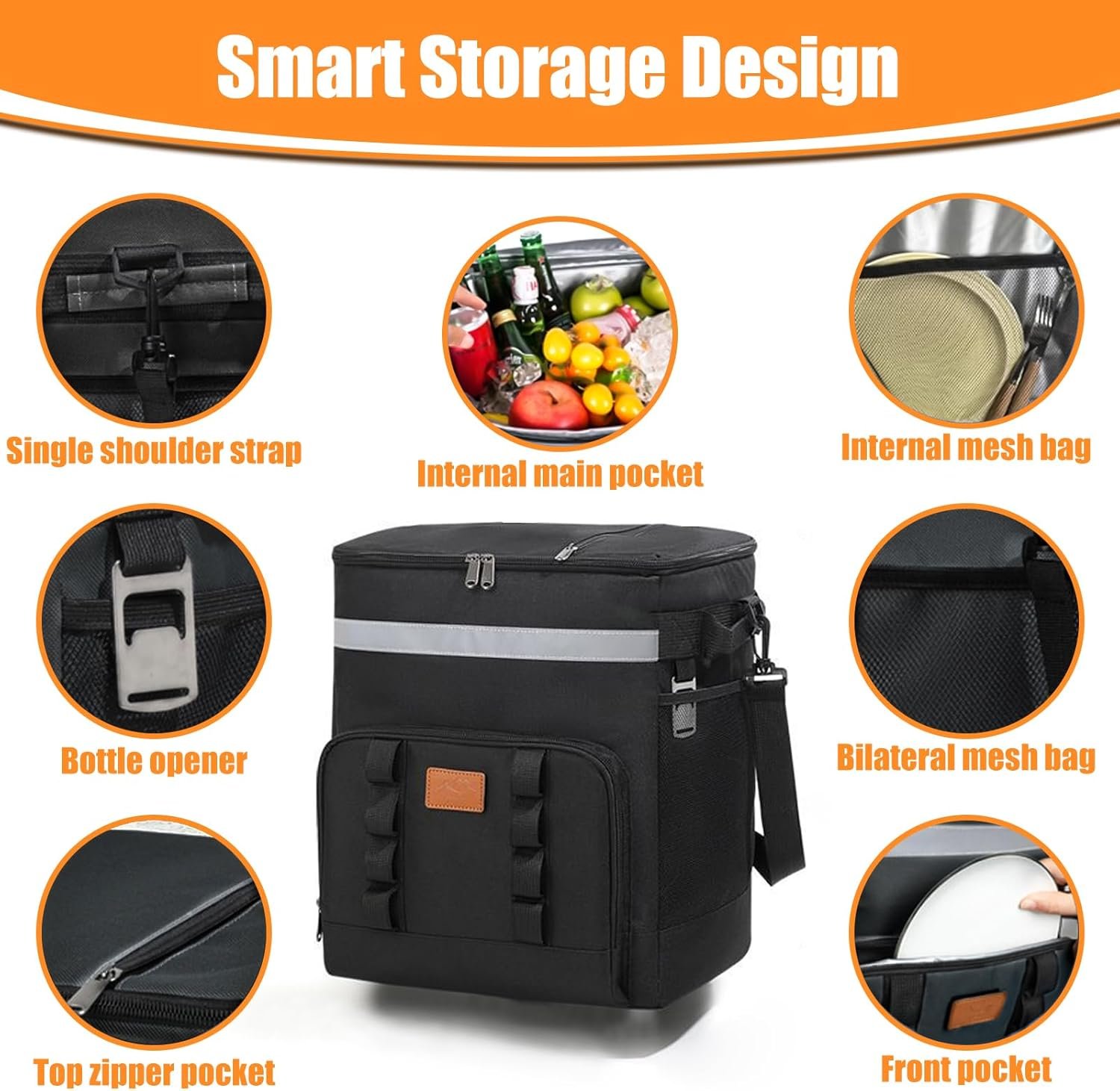 Amplio almacenamiento de 30 litros con diseño inteligente: este enfriador suave ofrece una capacidad completa de 30 litros en un solo compartimento fácil de usar, perfecto para comidas completas, aperitivos y bebidas. Lleva fácilmente tu equipo sin la mayor cantidad de compartimentos complicados que a menudo se ven en diseños más fríos sobre ruedas. Duradero y ligero con diseño de seguridad reflectante: hecho de tela Oxford 600D de alta calidad y forrado con prácticas tiras reflectantes, esta hielera proporciona una excelente durabilidad y visibilidad nocturna, todo en una forma elegante que es mucho más ligera que una típica hielera con ruedas. Fácil de usar con cremalleras y abridor de alta calidad: equipado con cremalleras dobles suaves para un fácil acceso y un abridor de botellas integrado, este enfriador de mochila hace que sea fácil disfrutar de tus bebidas sobre la marcha. Perfecto para días de playa o almuerzos. Ergonómico y cómodo de llevar todo el día: a diferencia de los enfriadores tradicionales con ruedas, nuestro diseño elimina los marcos de ruedas pesados, lo que hace que esta bolsa térmica suave de viaje sea ideal para largos paseos, paseos en bicicleta o viajes por la ciudad sin arrastre. Multiusos para cualquier aventura al aire libre: desde picnics en el parque hasta senderos de senderismo o fiestas en estacionamiento, esta hielera compacta con ruedas alternativa se adapta perfectamente a cualquier estilo de vida. Diseñada para portabilidad y estilo, es tu mochila aislada para días activos.