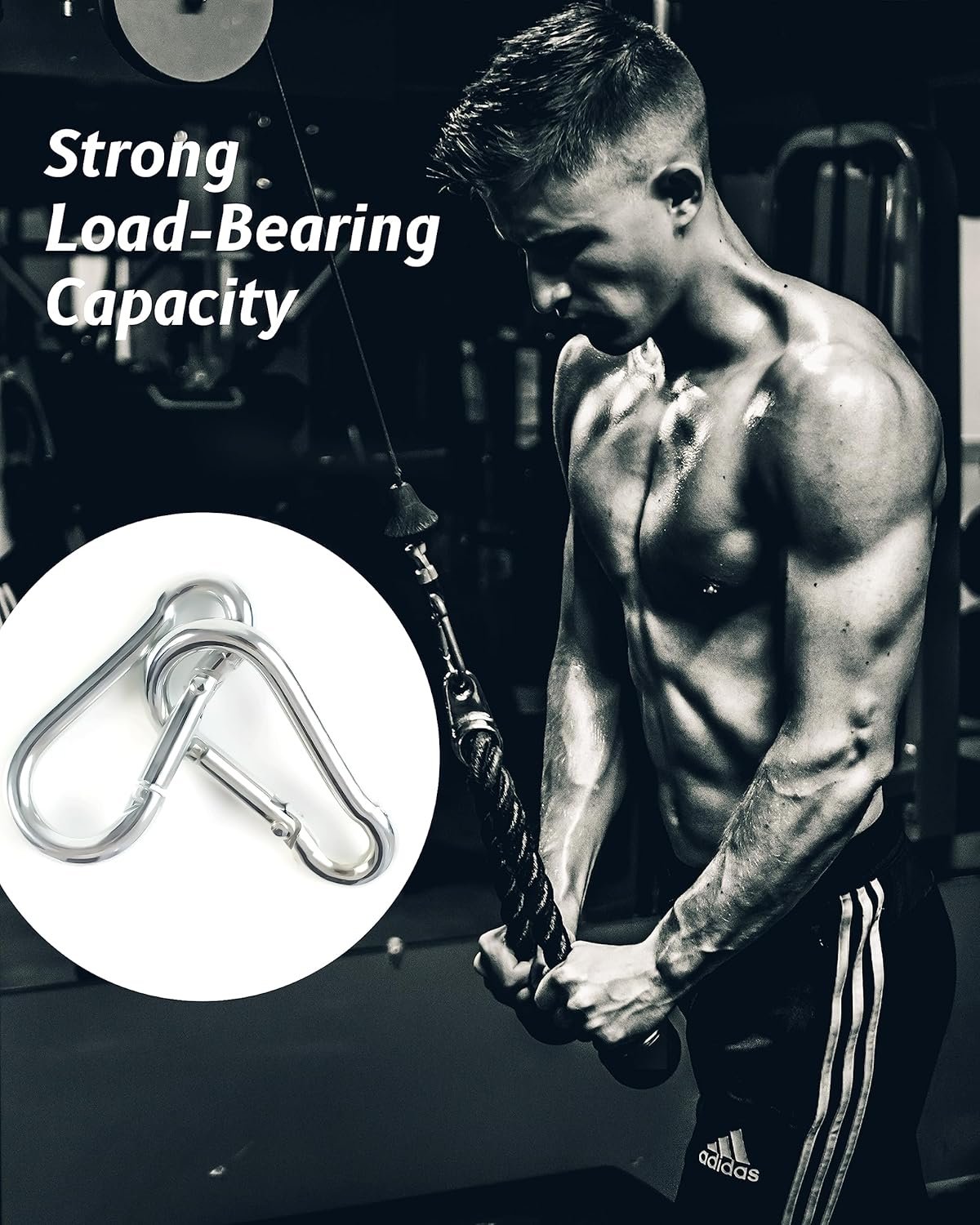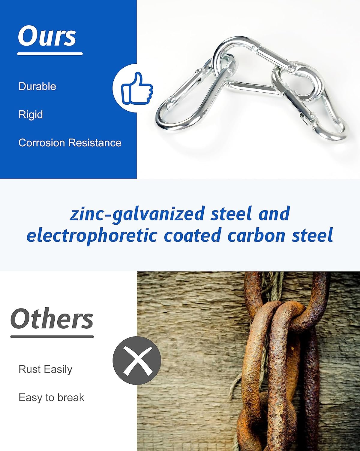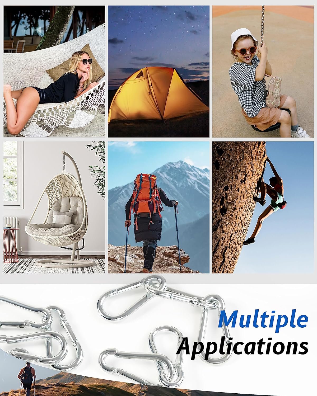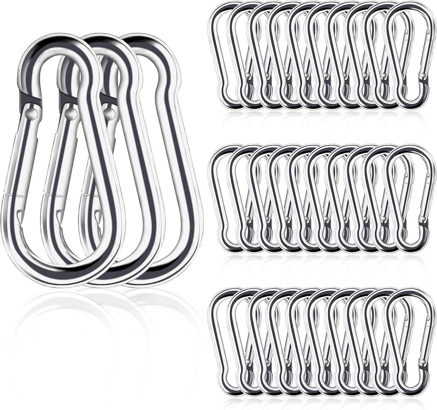 Pequeño Nuestra longitud del gancho a presión: 4,0 cm, ancho: 2,0 cm Resistente: la potente carga de 120 libras hace que los mosquetones sean lo suficientemente fuertes como para enganchar, colgar o fijar tus herramientas o artículos importantes. Antioxidante y duradero: los mosquetones están hechos de acero inoxidable de alta calidad, son resistentes al desgaste, a prueba de óxido y se pueden utilizar durante mucho tiempo incluso bajo el mar. Apertura o cierre suaves El diseño de resorte del gancho de resorte se puede fijar rápidamente al lugar que desees, y se puede abrir o cerrar fácilmente con una mano, lo que es muy conveniente.