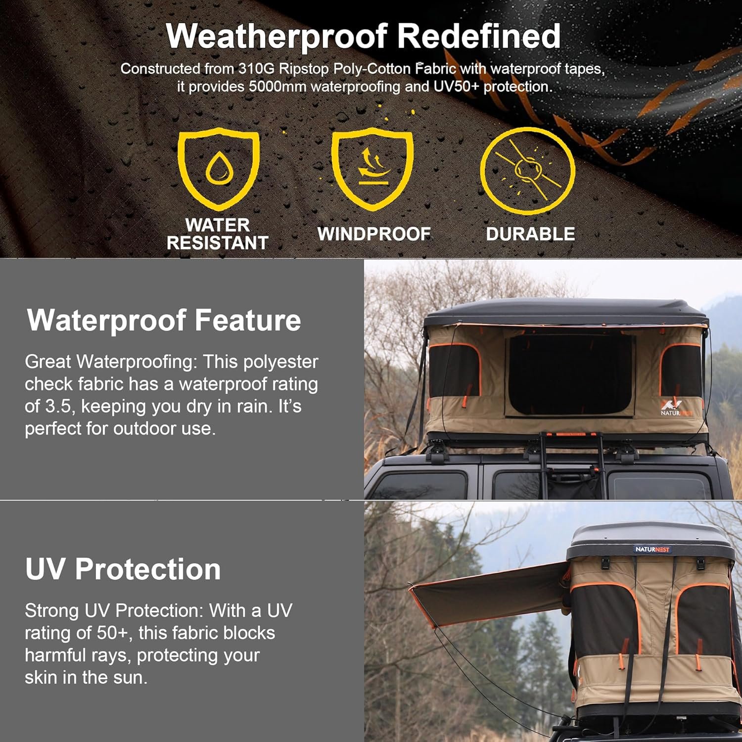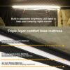 Rendimiento impermeable doblado: cuenta con una calificación impermeable de nivel 5 para el toldo exterior (resistencia a la presión del agua hasta 10000) y un nivel de resistencia al agua de 3.5 para el cuerpo principal, asegurando comodidad seca incluso en condiciones de lluvia. Comodidad mejorada: equipado con un colchón de espuma de 1.4 in de grosor, una manta oceánica de 0.1 in de grosor y una alfombrilla condensadora de 0.2 in de grosor, el diseño del colchón de tres capas elimina la necesidad de compras adicionales, ofreciendo una experiencia de sueño cómoda. Tira de luz LED con tres ajustes de color: la tira de luz LED integrada con tres modos de color (blanco, cálido y blanco cálido) proporciona una iluminación perfecta tanto para el interior como para el exterior de la tienda de campaña por la noche. Puerto USB integrado: conveniente puerto USB integrado para cargar dispositivos mientras mantiene la conexión con el mundo exterior, sin ocupar espacio de la tienda. Diseño único: ocupa solo la mitad del espacio del techo de tu automóvil, dejando la otra mitad libre para bicicletas, estantes de almacenamiento u otros equipos, maximizando el espacio y la practicidad. Materiales de alta resistencia: construido con una carcasa de ABS duradera y marco de aluminio de alta resistencia, con una capacidad de carga de hasta 661.4 lbs (661 libras) para una durabilidad y seguridad inigualables. Garantía de un año: respaldado por una garantía de 1 año, asegurando tranquilidad y resolución rápida para cualquier problema durante el uso.