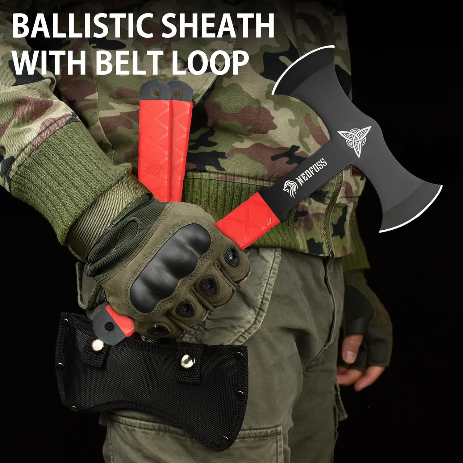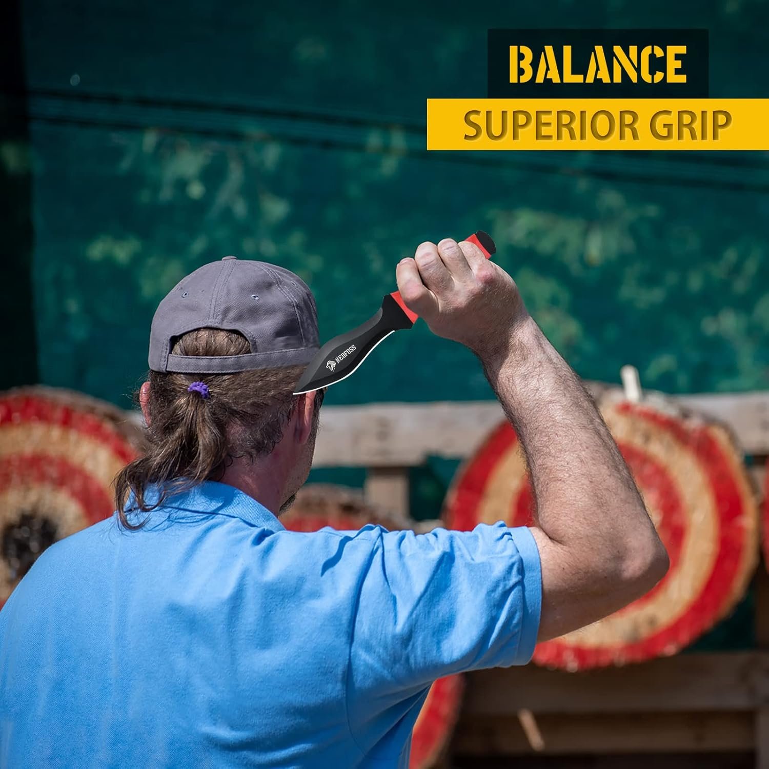 Construcción de una sola pieza resistente y equilibrada con peso: la hoja fija de espiga completa de alta calidad no es fácil de doblar, deformar o romper. El juego de hacha y cuchillos NedFoss está diseñado con puntas bien equilibradas, perfectamente pesadas y ultra afiladas para que los lanzadores principiantes puedan lanzar fácilmente objetivos. Mango de goma duradero: goma adicional proporciona un agarre más cómodo y antideslizante. Además, el llamativo mango rojo mejora la visibilidad de lanzar hachas en tu patio trasero o nieve, hojas o hierba, lo que te hace no preocuparte por no encontrar a los halcones lanzadores. Conveniente funda de hacha y cuchillo: el diseño preciso mantiene su hacha y cuchillo afilados y asegura cada hacha y cuchillos de lanzamiento en la funda del hacha y la funda del cuchillo. La funda EDC también es conveniente para que disfrutes de la diversión de lanzar. Dimensión del eje: 30,2 cm de longitud total con una longitud de hoja de 6,6 cm, y cada peso de 13 onzas. Dimensión del cuchillo: 22,6 cm de longitud total con una longitud de hoja de 4,0 cm, y cada peso de 5.78 onzas.