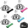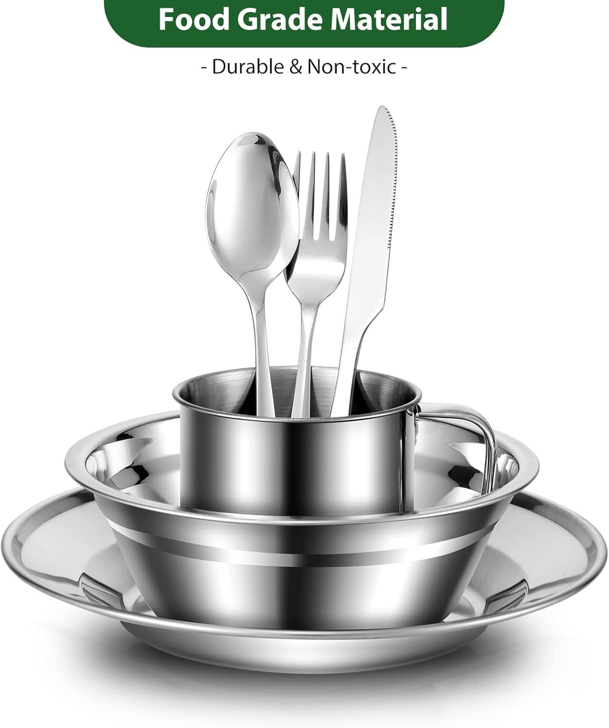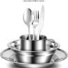 Un juego completo que necesitas: este kit de desorden de camping incluye 29 piezas esenciales. 4 cuencos de 16,0 cm, 4 platos llanos de 20,3 cm, 4 tazas de 10 onzas, 4 cubiertos (4 tenedores, 4 cucharas, 4 cuchillos) con estuches, 1 bolsa de malla de grado alimenticio. Calidad duradera y segura: Hecho de acero inoxidable de alta calidad para garantizar el máximo lujo y durabilidad. A diferencia de los de plástico, este juego no contiene BPA, no mancha ni absorbe olores. Fácil de limpiar y apto para lavavajillas: el juego de tazas y cuencos de camping está diseñado de forma inteligente para ayudar a que la limpieza sea un proceso rápido y sencillo. Además, es apto para lavavajillas para mayor comodidad. Llévalo a cualquier lugar: cada juego de cubiertos se puede empacar en la bolsa de malla de grado alimenticio para un fácil almacenamiento. Puedes recogerlo mientras largas caminatas, camping, picnic, fiesta en la playa y mucho más. Ideal para interiores y exteriores: ideal para acampar familiar, vehículos recreativos y uso doméstico.