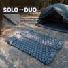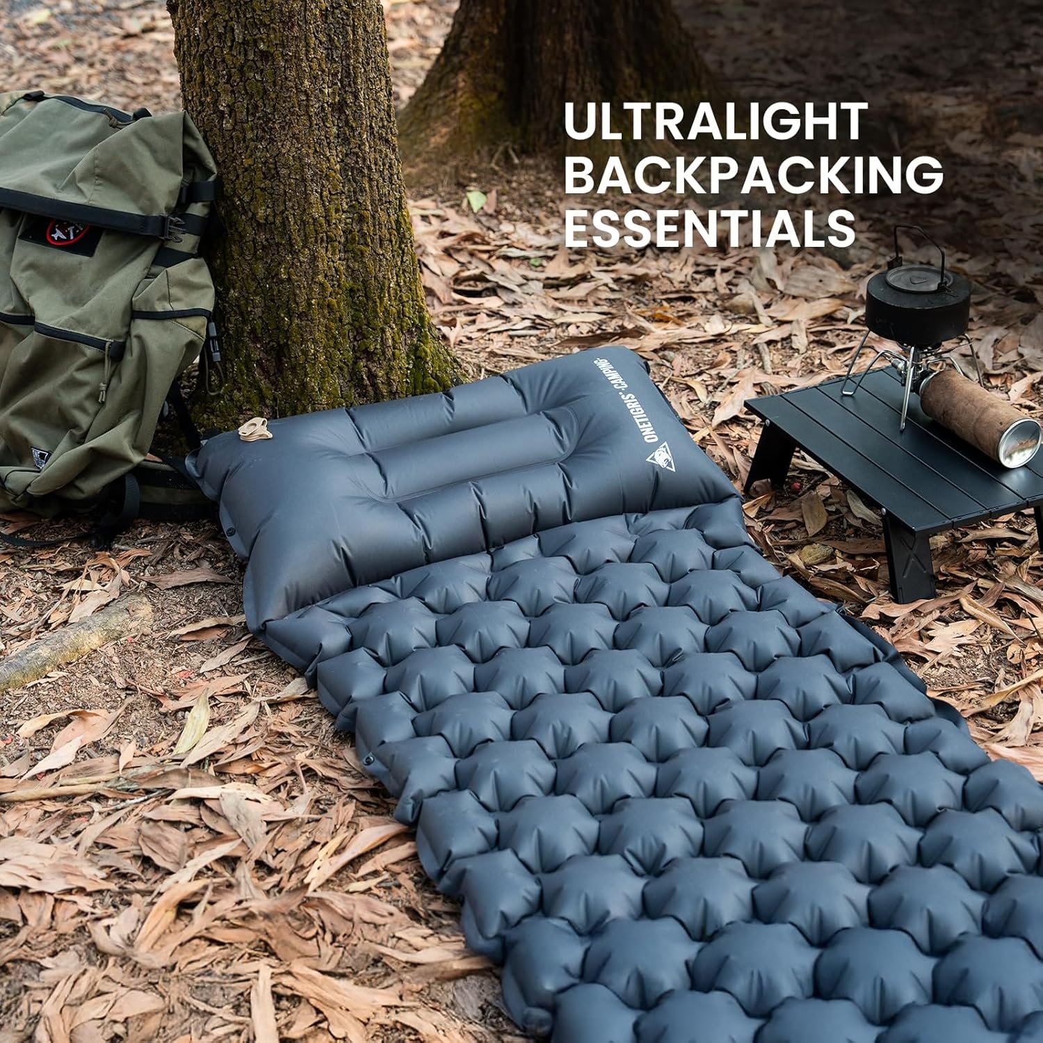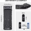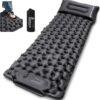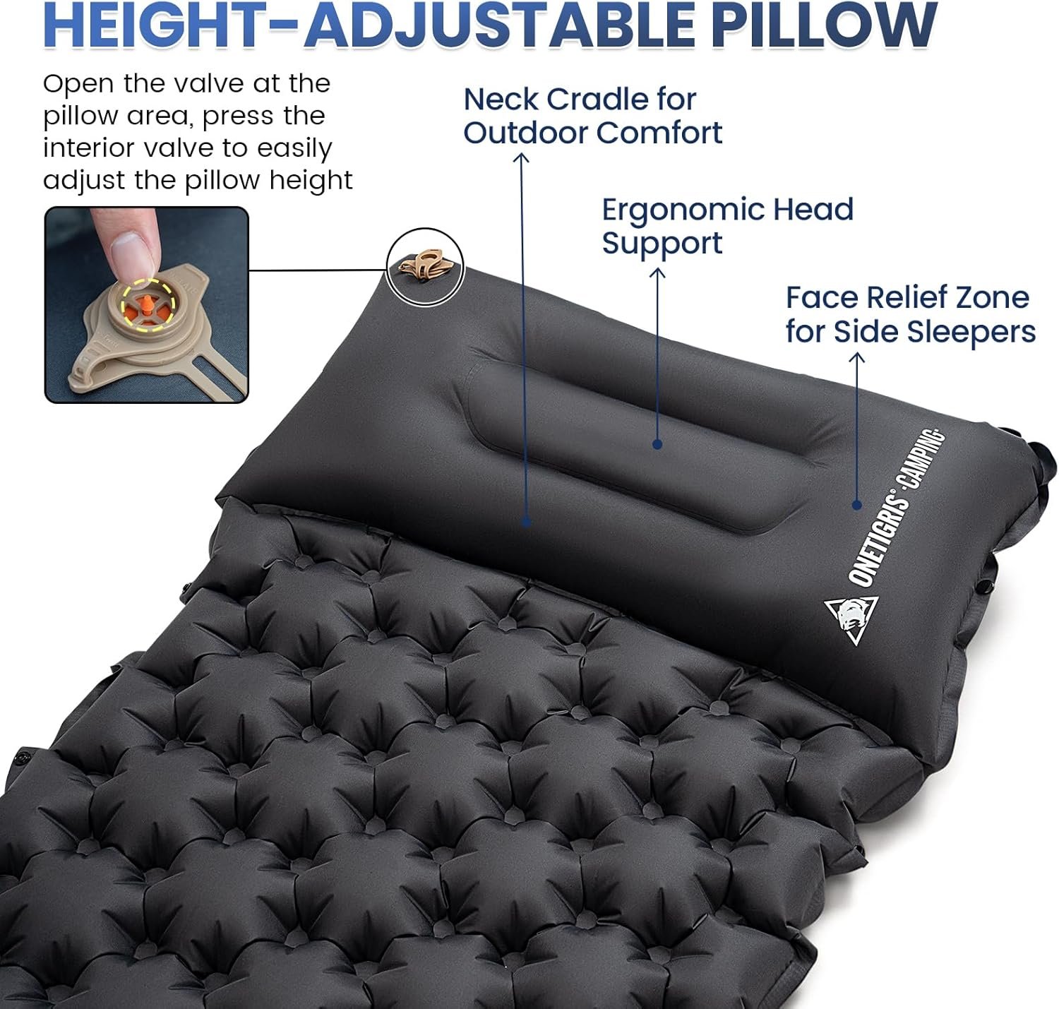 Sleep Like a King Under the Stars Tired of waking up sore after a night on the hard ground? Our upgraded 2025 Onetigris BLACKCRYSTAL camping sleeping pad is here to revolutionize your outdoor sleep experience! With 5.1 cm of plush thickness and ergonomic egg-shaped air cells and height-adjustable built-in pillow, this sleeping pad cradles your body, providing unmatched support for your back, neck, and joints. Whether you re a back sleeper or a side sleeper, you ll wake up refreshed and ready to conquer the day Convertible to Double Bed with Easy Snap Buttons Camping with a partner or family? No problem! The Onetigris Camping sleeping pad features easy-to-use snap buttons on both sides, allowing you to connect two pads into a spacious double bed. Simply purchase two pads, snap them together, and enjoy a king-sized sleeping space under the stars. Whether you re camping with your partner, friends, or kids, this innovative design provides enhanced comfort and relaxation for everyone. Say goodbye to cramped sleeping arrangements and hello to a restful night s sleep 30-Second Inflation & 1-Second Deflation 2025 Upgraded version of Onetigris camping pad includes a larger built-in foot pump! Our built-in oversized foot pump lets you inflate the pad in just 30-60 seconds no mouth, hands, or extra pumps needed. The patented flip valve makes deflation a breeze just pull the valve, and it s done in 1 second. Perfect for quick setups and pack-ups, so you can spend more time enjoying nature Durable & Comfortable Materials Crafted from premium 190T Pongee fabric with an inner TPU sealing coating, our camping sleeping pad is built to last. It s durable, tear-resistant, and easy to clean, ensuring it withstands rough outdoor conditions. The ergonomic design guarantees a restful night s sleep, no matter the terrain. Rigorously tested for quality, this pad is perfect for outdoor mats, camping, tent floors, and more Ultralight & Compact for Any Adventure Weighing just 1.67 lbs (760g) and folding down to the size of a water bottle (11.8 x 4.7 x 4.7 ), Onetigris Camping sleeping pad is a backpacker s dream. The built-in pillow saves space and weight, making it perfect for hiking, backpacking, climbing, or even hosting guests at home. Throw it in your backpack and go your comfort is never left behind. The package includes the sleeping pad, a storage bag, and a repair kit Foot Pump Usage Instructions When using the foot pump, be sure to open the valve cover on top of the pump and fully cover the valve with your foot before pressing down – . !