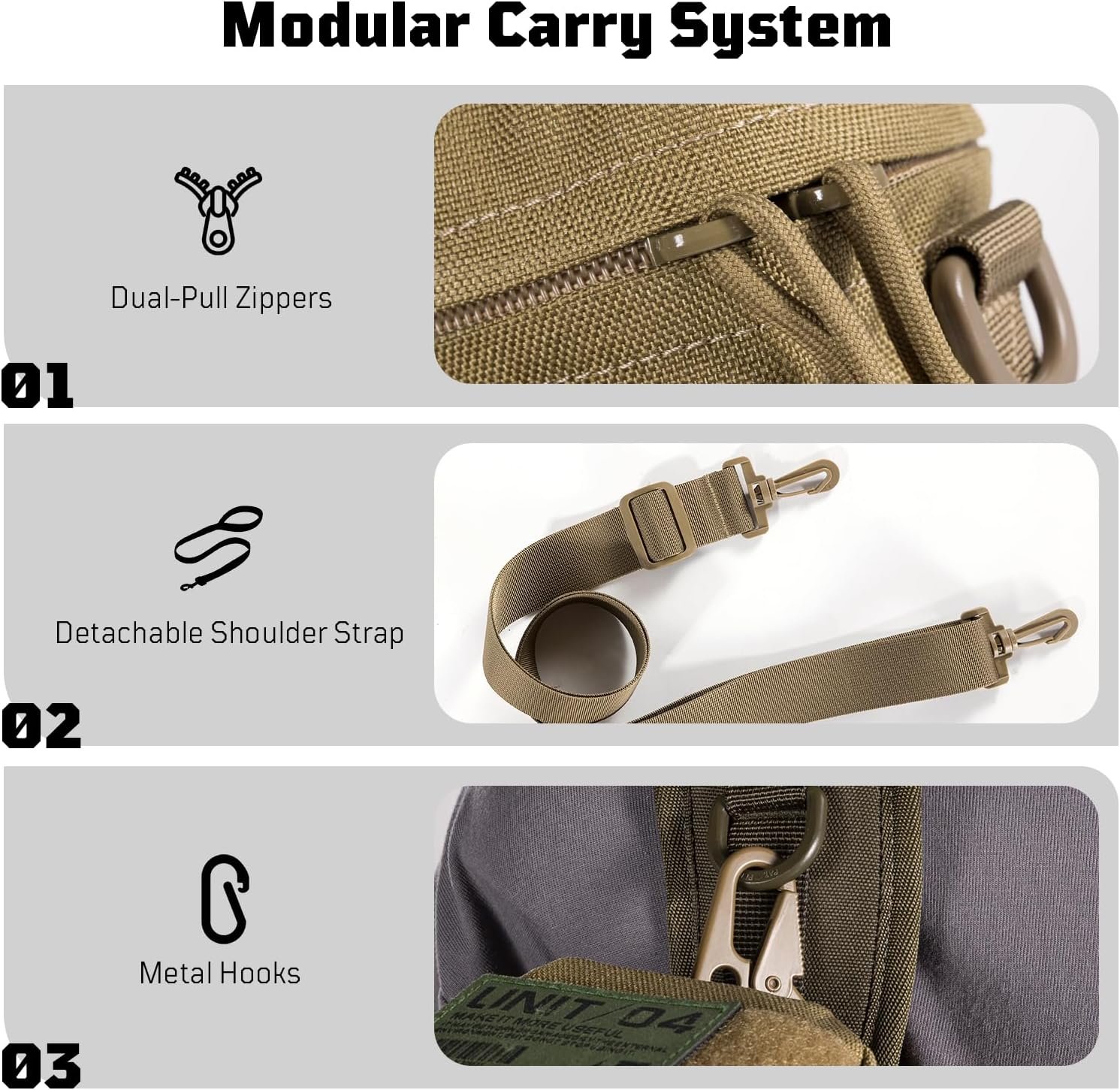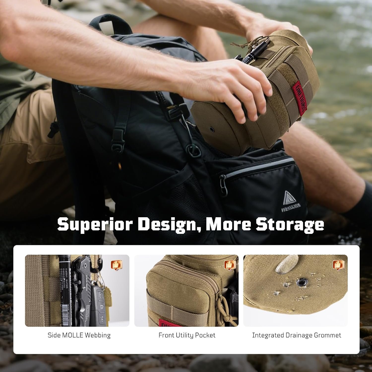 El soporte táctico para botellas de agua OneTigris está hecho de tela de nailon 1000D transpirable y resistente al desgaste de alta densidad, que puede fijar y proteger eficazmente la botella de agua sin lesiones. No se deforma fácilmente, costuras duraderas, hacen que la bolsa para botella de agua sea más duradera. También hay pequeños módulos de Magic Tape en la parte delantera y superior, que se pueden pegar con insignias y otros signos. Un ojal inferior garantiza que el exceso de humedad drene sin esfuerzo de la bolsa. Paquete múltiple : la bolsa de transporte de hidratación táctica tiene capacidad para botellas de agua de hasta 32 onzas, tamaño: 24,9 cm de alto x 10,9 cm de diámetro x 4.3 in de alto, lo suficientemente grande para la mayoría de botellas de 32 onzas, bolsas de agua de 1 litro, frascos de comida de campamento y botellas de agua de boca ancha, incluyendo 33 onzas Nalgene, y Hidrohidrato de 32 onzas Frascos. La bolsa deportiva para botellas de agua es ideal para actividades al aire libre como camping, senderismo, ciclismo, juego de guerra, caza, senderismo, pesca, equitación, etc. La bolsa para botella de agua Molle está bien diseñada y es versátil, no solo te permite llevar fácilmente agua y otros artículos durante las actividades al aire libre, sino que también es compatible con cualquier sistema de correas Molle, 2 correas traseras Molle te permiten fijar en una mochila o cinturón grande. La correa lateral Molle te permite colgar pequeños artículos al aire libre como linterna pequeña y llaves. El bolsillo frontal de la bolsa de la cantina Molle es de 16,0 cm de alto x 9,9 cm de ancho, con una cremallera bidireccional de alta calidad, fácil de abrir y cerrar la bolsa. El bolsillo frontal puede proporcionar espacio adicional para almacenar más cosas como suministros de primeros auxilios, kit de píldoras, teléfono celular, llaves, máscara, tapones para los oídos u otros objetos pequeños. La bolsa para botella de agua Molle tiene mucho espacio para garantizar que tengas acceso rápido a todo lo que necesitas cuando estás en movimiento. La funda para botella de agua viene con una correa para el hombro, que es ajustable y extraíble con 2 anillos en D que se pueden fijar como una bolsa de un solo hombro o una bolsa cruzada; las 2 correas traseras Molle te permiten fijarla en la mochila o cinturón; el gancho trasero se puede colgar y llevar a voluntad, conveniente y práctico.