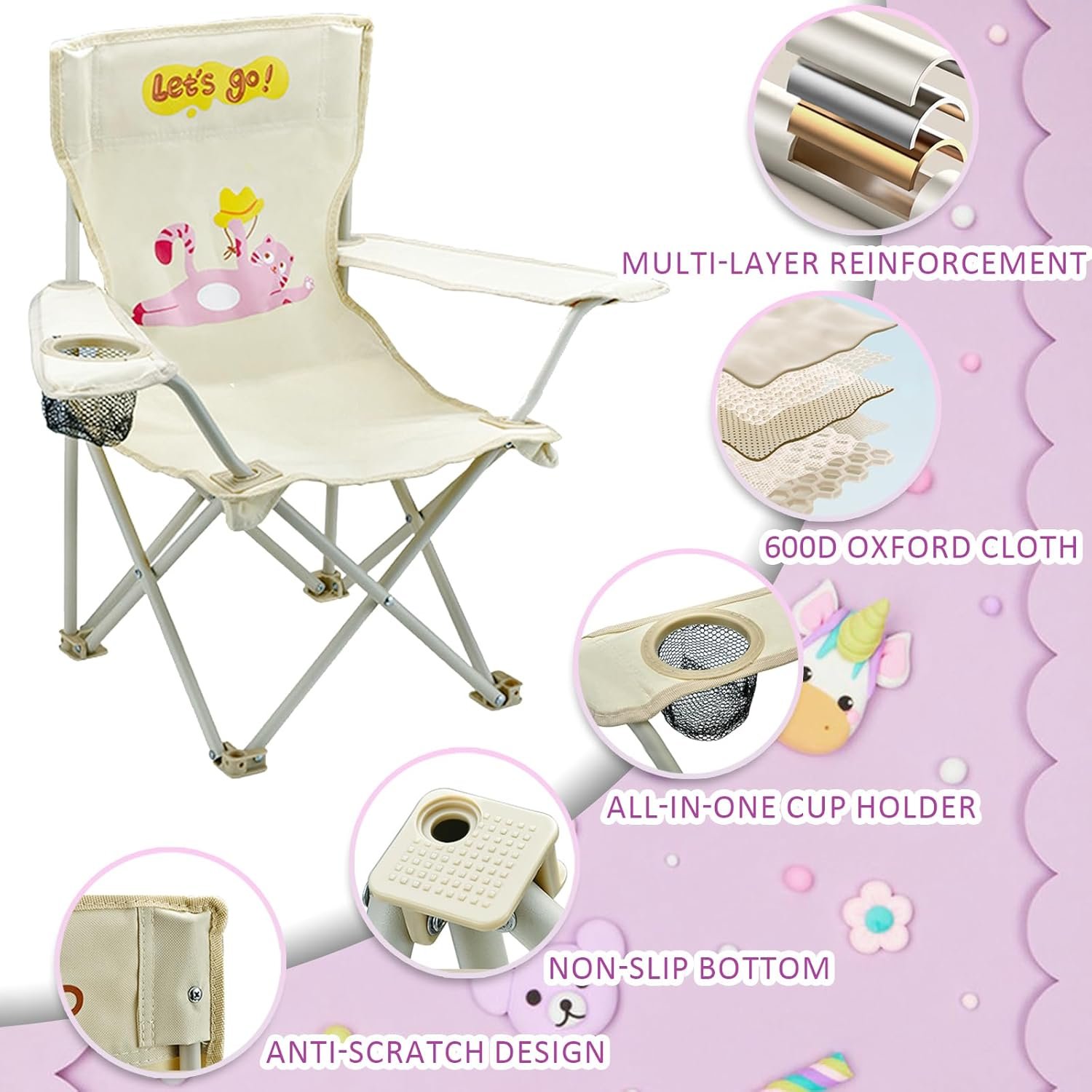 Comodidad inigualable: las sillas plegables de playa han sido probadas y mejoradas por nosotros para lograr la postura humana más cómoda. Para que su hijo pueda obtener la relajación más perfecta en la silla de playa, ¡deje que su hijo tenga un tiempo de ocio acogedor es mi deseo común y el tuyo! Materiales fuertes y ligeros: nuestras sillas de camping para niños están hechas de material de acero resistente, lo que garantiza que tus hijos no correrán peligro incluso si juegan en las sillas. Por supuesto, también tenemos en cuenta el peso ligero de la silla plegable, que se encoge y se despliega en un segundo para reducir su carga de viaje Tiempo más relajante: esta silla plegable de playa ha sido diseñada por nosotros para ser fácil de usar sin importar si estás en el jardín de la playa, esta silla plegable también incluye un portavasos de malla para mantener a tu hijo hidratado en todo momento Evita quemaduras solares: la silla plegable está equipada con un parasol adecuado para proteger la piel de tu hijo de los fuertes rayos UV incluso mientras te relajas en la playa. El parasol también se puede combinar en un paraguas por el mango. El diseño 2 en 1 ahorra más espacio SEGURO Y FÁCIL DE LIMPIAR: La silla de playa tiene una variedad de estructuras triangulares y cuatro patas de apoyo con diseño antideslizante, que tiene una gran estabilidad y puede adaptarse a una variedad de terrenos. La tela está hecha de tela Oxford de alta calidad, segura, no tóxica y resistente al desgaste y antiarañazos, se puede limpiar con agua y jabón suave