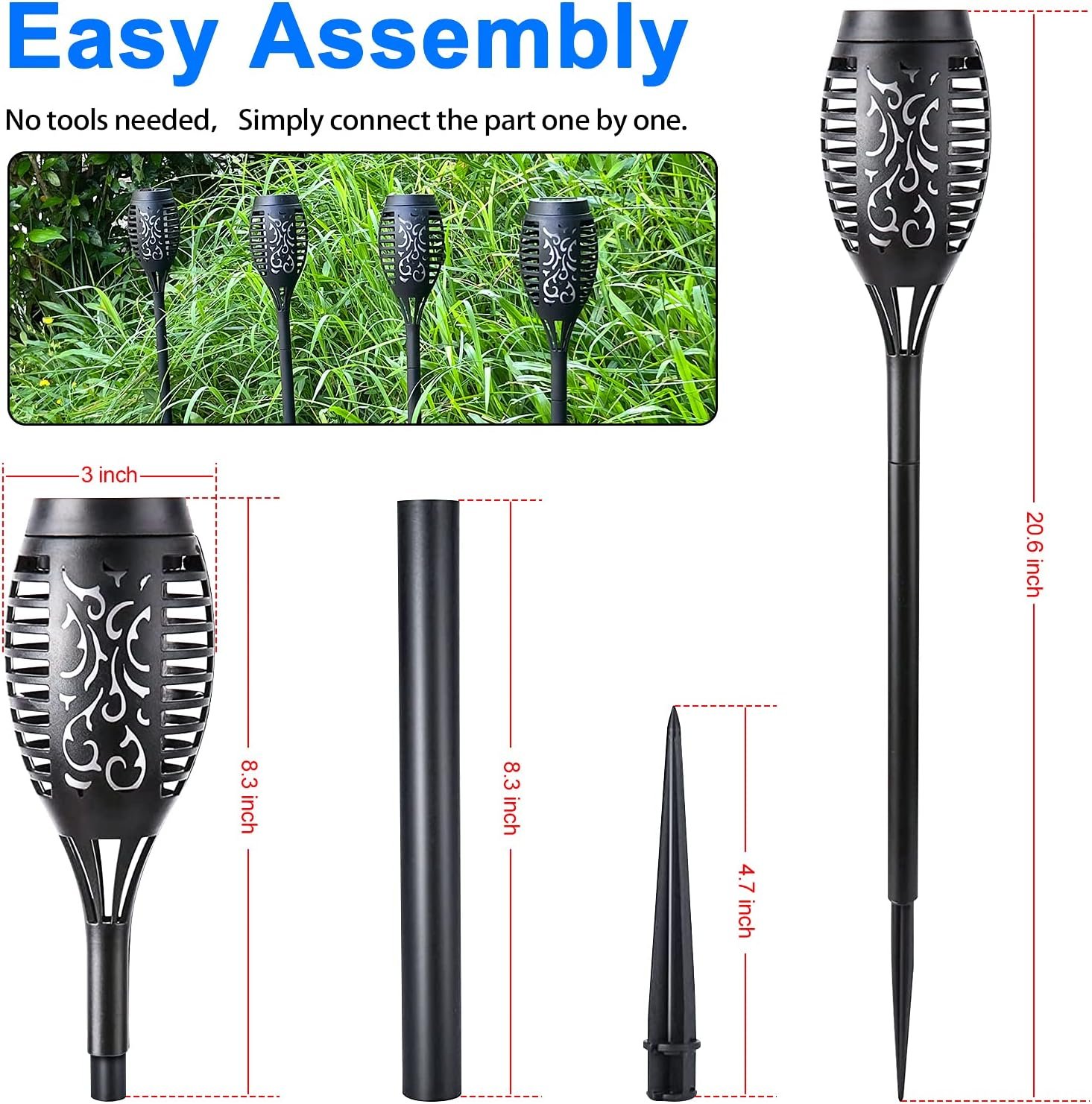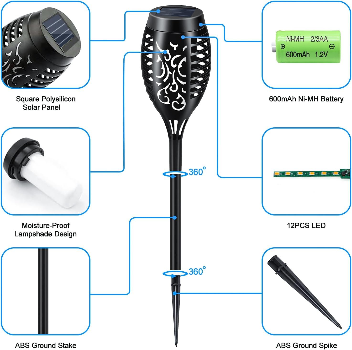 Paquete de 6 luces solares: bonito diseño de llamas parpadeantes, efecto de llamas realistas, las luces solares para exteriores parpadean una llamas bailarinas para decorar e iluminar tu casa, jardín, patio, camino, adecuado para camping, barbacoa, boda, Navidad, Halloween, etc. Luces alimentadas por energía solar: cada antorcha solar tiene 12 LED, equipada con una batería recargable de alta capacidad de 600 mAh, se carga automáticamente durante 6-8 horas durante el día y comienza a iluminar automáticamente durante 8-10 horas por la noche. (Nota: La duración se ve afectada por el clima y la luz, se recomienda instalar en un lugar con suficiente luz) Resistente a la intemperie: con excelente material ABS y diseño impermeable, las luces de paisaje pueden soportar la mayoría de las condiciones climáticas, sin preocuparse por la lluvia, la nieve. Perfecto para uso en exteriores. Una hermosa iluminación decorativa para tu jardín, patio, camino, patio trasero, etc. Encendido/apagado automático: sensor de luz sensible integrado, se enciende automáticamente al anochecer y se apaga al amanecer. No hay necesidad de operar el interruptor de encendido/apagado una y otra vez, lo que te ofrece una gran comodidad. Cuando utilices por primera vez luces solares para exteriores, cambia el botón de encendido y cárgalas bajo la luz solar directa al menos 8 horas. Fácil de instalar: sin herramientas ni cables, simplemente conecta la estaca e instálalas en el suelo, sin necesidad de pasar demasiado tiempo en la instalación. Nota: es alimentado por energía solar, instálelo en el lugar donde pueda obtener luz solar directa. Si tiene alguna pregunta, por favor póngase en contacto con nosotros en cualquier momento.