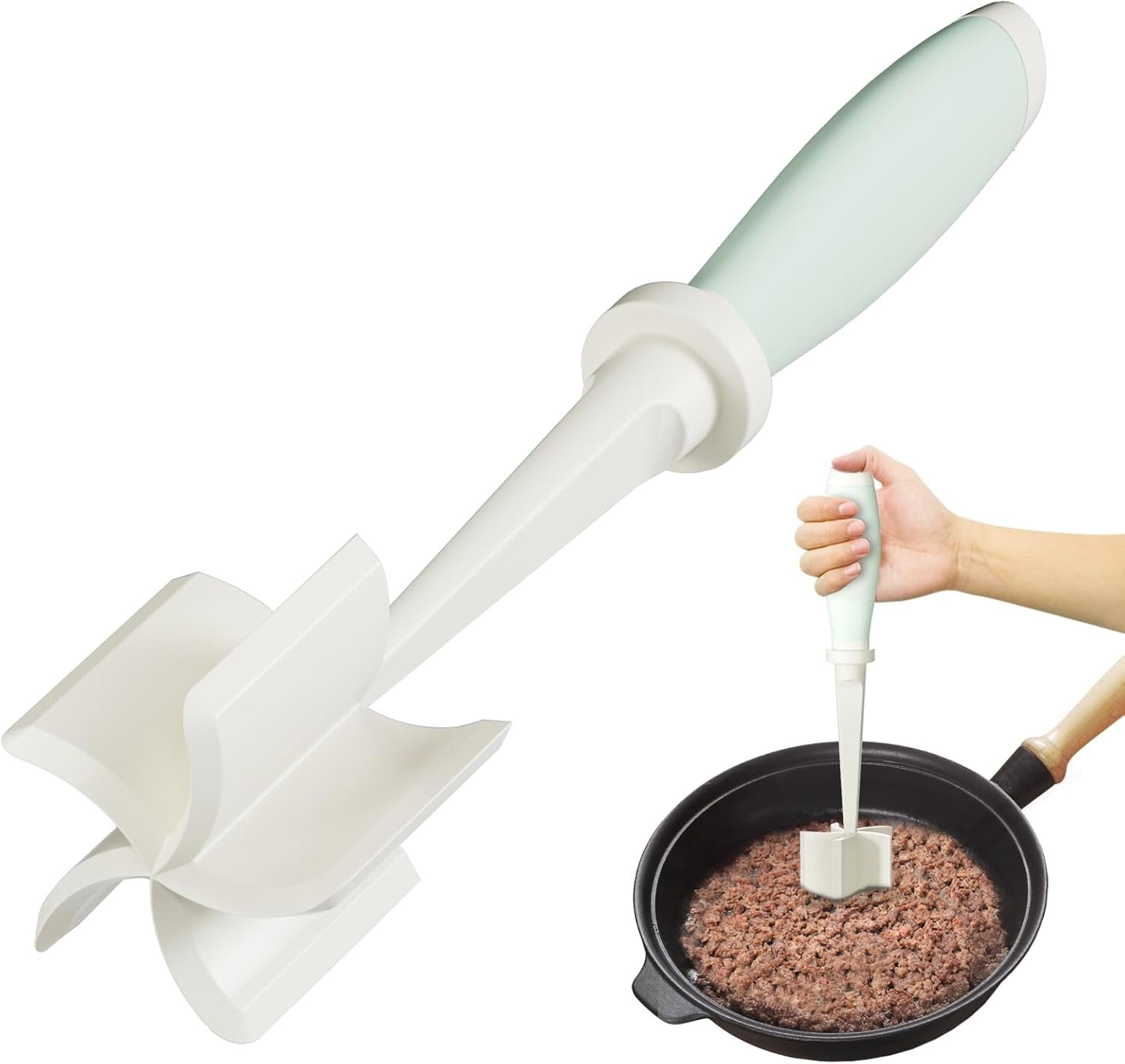 Fácil de mezclar y picar: el triturador de carne con 5 cuchillas de molinete biseladas anchas, es fácil de cortar y desmenuzar alimentos. Diseño de mango ergonómico que puede adaptarse perfectamente a la curva de tu mano y aumentar el agarre, es antideslizante y alivia en gran medida la fatiga de la mano mientras tiene un agarre prolongado. Diseñado en Estados Unidos. Material mejorado y resistente al calor: nuestro picador de carne está hecho de nailon de grado alimenticio mejorado, que es más duradero y cómodo que otros productos. Antiadherente, inodoro, libre de BPA. El triturador de carne es resistente al calor hasta 428 grados Fahrenheit, garantiza una cocción uniforme directamente en la sartén. Ideal para carne molida, carne de hamburguesa, mezcla de condimentos para hamburguesas. Duradero y multiusos: nuestro picador de hamburguesas con diseño mejorado, suficiente para hacer el trabajo sin dañar las sartenes. Sin óxido, no se rompe, durabilidad superior. Herramienta de triturador de carne también ideal para usar en otros tipos de alimentos como gelatinas, frutas, verduras, papas y otros tipos de carnes. Fácil de limpiar: el utensilio para machacar carne adopta un diseño antisuciedad, superficies antiadherentes, simplemente enjuaga con agua y luego puedes limpiar el utensilio de hamburguesa molido, apto para lavavajillas. El triturador de carne molida podría ser un regalo para tu familia o amigos para que cocinar sea mucho más fácil y maravilloso. Herramienta de cocina perfecta: esta herramienta de cocina trituradora presionando las cuchillas en los alimentos cocinados hasta lograr la consistencia deseada; las cuchillas en ángulo raspan los lados de los cuencos y ollas mientras se mezclan y trituran. Es hora de decir adiós a los tenedores, palas y cucharas mientras decoces la carne molida porque ahora solo necesitas esta herramienta picadora de carne.