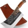 Carne Cleaver – Primero debes saber que este es un cuchillo forjado a mano con acero de alto carbono y acero de alto manganeso, el acero de alto carbono tiene una mejor capacidad para mantener los bordes afilados y mejora en gran medida la dureza del cuchillo de carnicero a 60-62 RHC. Te ayudará con cada corte perfecto. Mantenimiento razonable después de cada uso, durará una larga vida útil. Hoja de alta calidad: la hoja del cuchillo es de 8.4 in de largo, 4.0 in de ancho y 0.1 in de grosor, hecha por artesanos experimentados rectificando y forjando a mano. Ha sido cuidadosamente forjado, molido y pulido con buena nitidez, dureza, durabilidad y excelente rendimiento de corte. La superficie especial del cuchillo forjado es agradable y antiadherente vegetales, puedes terminar tu trabajo diario de corte de cocina de manera efectiva. Cuchillo multifuncional: este cuchillo de cocina resistente es perfecto para cortar huesos de pollo, cortar carne o cortar verduras en cubitos. Cumple eficazmente con los diversos usos del cuchillo de cocina. Es adecuado tanto para cocinas domésticas como para restaurantes. Equipado con una funda de cuero portátil. Puedes llevarlo a cualquier actividad al aire libre como camping, pesca, barbacoa, senderismo, etc. Diseño superior: el mango hecho de palisandro de primera calidad es más resistente al desgaste y anticorrosivo, con dos maravillosas tallas de latón en forma de dragón, el cuchillo de carnicero será un paisaje absolutamente hermoso en tu cocina. Durante su uso a largo plazo, su muñeca no estará demasiado fatigada. Rendimiento impecable este diseño fuerte con una buena resistencia, durabilidad. Adecuado como un regalo ideal para estudiantes culinarios, cocineros caseros, chefs profesionales y mucho más. Regalo considerado que combina afecto y practicidad: estas tijeras premium son una opción de regalo sincera para amigos, familiares o colegas en inauguraciones de casa, cumpleaños, vacaciones y otras ocasiones. A diferencia de los regalos ordinarios que pueden olvidarse, integran una apariencia elegante, calidad duradera y funcionalidad versátil, convirtiéndose en una herramienta práctica que el destinatario puede usar a diario. Cada vez que tomen este cuchillo para cortar, sentirán tu cuidado sincero, haciendo que este regalo sea significativo