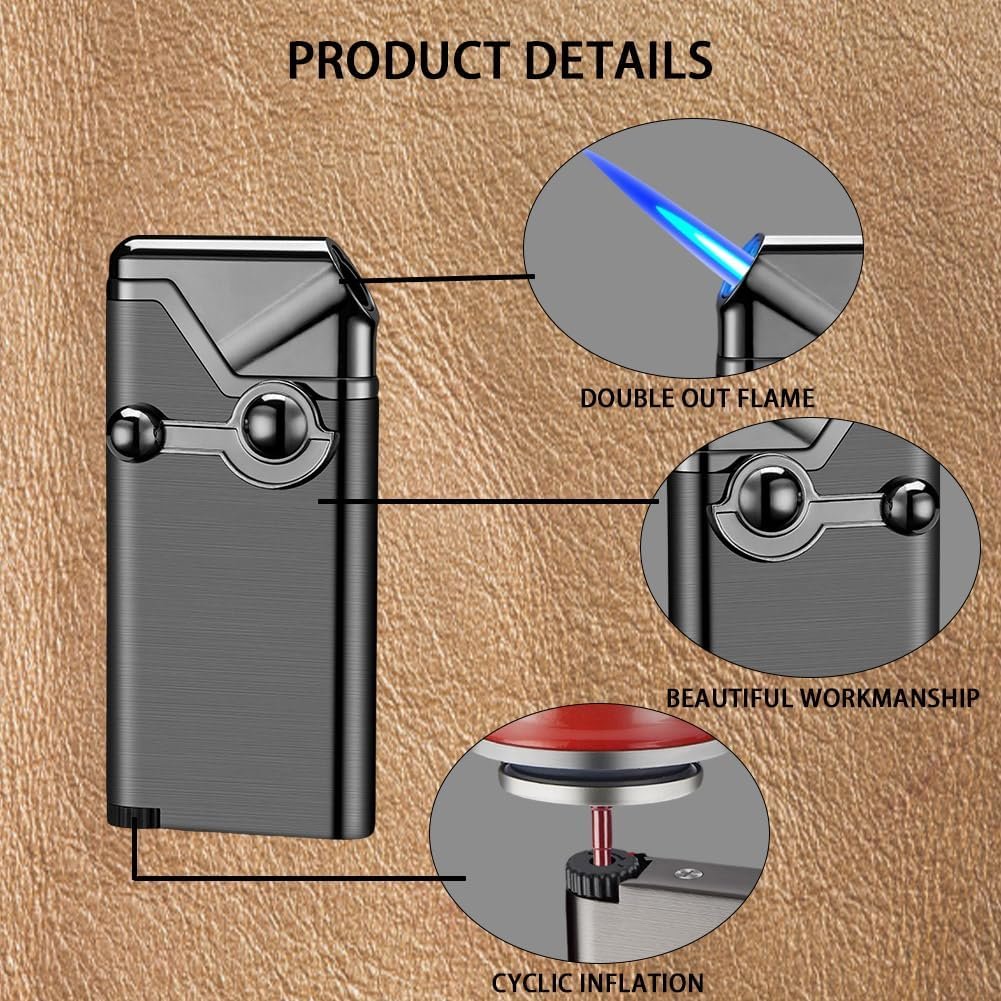 Sofisticación de alta gama: este encendedor está hecho de aleación de zinc, tiene tres capas de protección de seguridad. Potente encendedor de llama de chorro azul con válvula de salida de cobre. Válvula de recarga universal para facilitar el llenado de butano. Encendido por inyección rotativa: este encendedor vintage adopta un método creativo de encendido de eyección giratoria para hacer que el disparo sea más único; el cuerpo del plato giratorio se puede girar, lo que es muy adecuado para iluminación y juego. Ajustable y recargable: este encendedor de llama tiene un orificio de llenado de cobre puro y una rueda de ajuste de tamaño de llama ajustable en la parte inferior, el material de aleación de zinc está más sellado que el orificio de llenado tradicional del encendedor, no es fácil de filtrar. Puedes rellenar tu propio combustible de butano, solo tienes que invertir el encendedor vertical para inflar, reciclando más respetuoso con el medio ambiente. Multiusos: este encendedor de soplete también es adecuado para ocasiones como senderismo, viajes de campamento, barbacoa en la playa, parques, etc. Viene en una elegante caja, es un regalo perfecto para cumpleaños, amigos, novio, día del padre, aniversario, Acción de Gracias, Navidad. Nota: el combustible del encendedor no está incluido, todos los encendedores están vacíos, así que llénalos con combustible antes de encenderlos. Se recomienda el mantenimiento regular de encendedores vintage para prolongar su vida útil y número de usos.