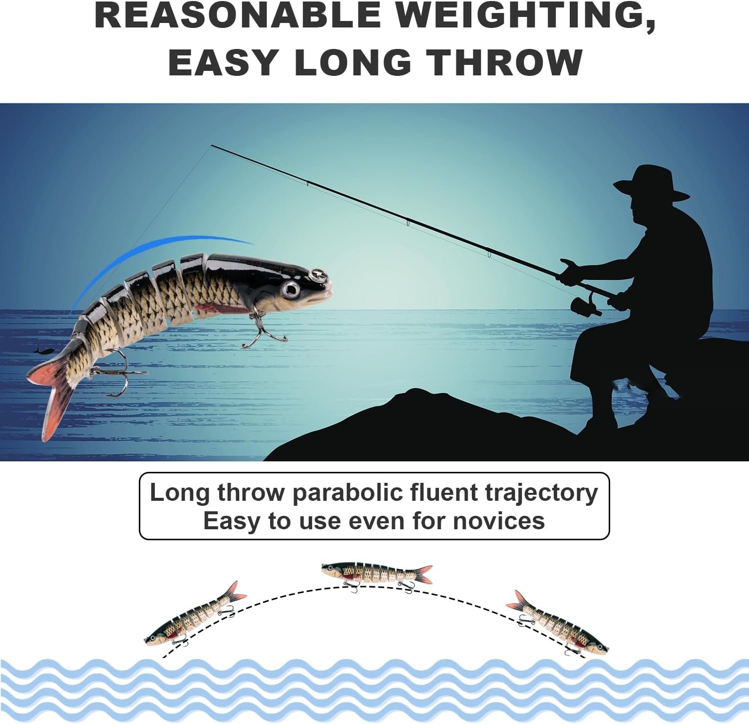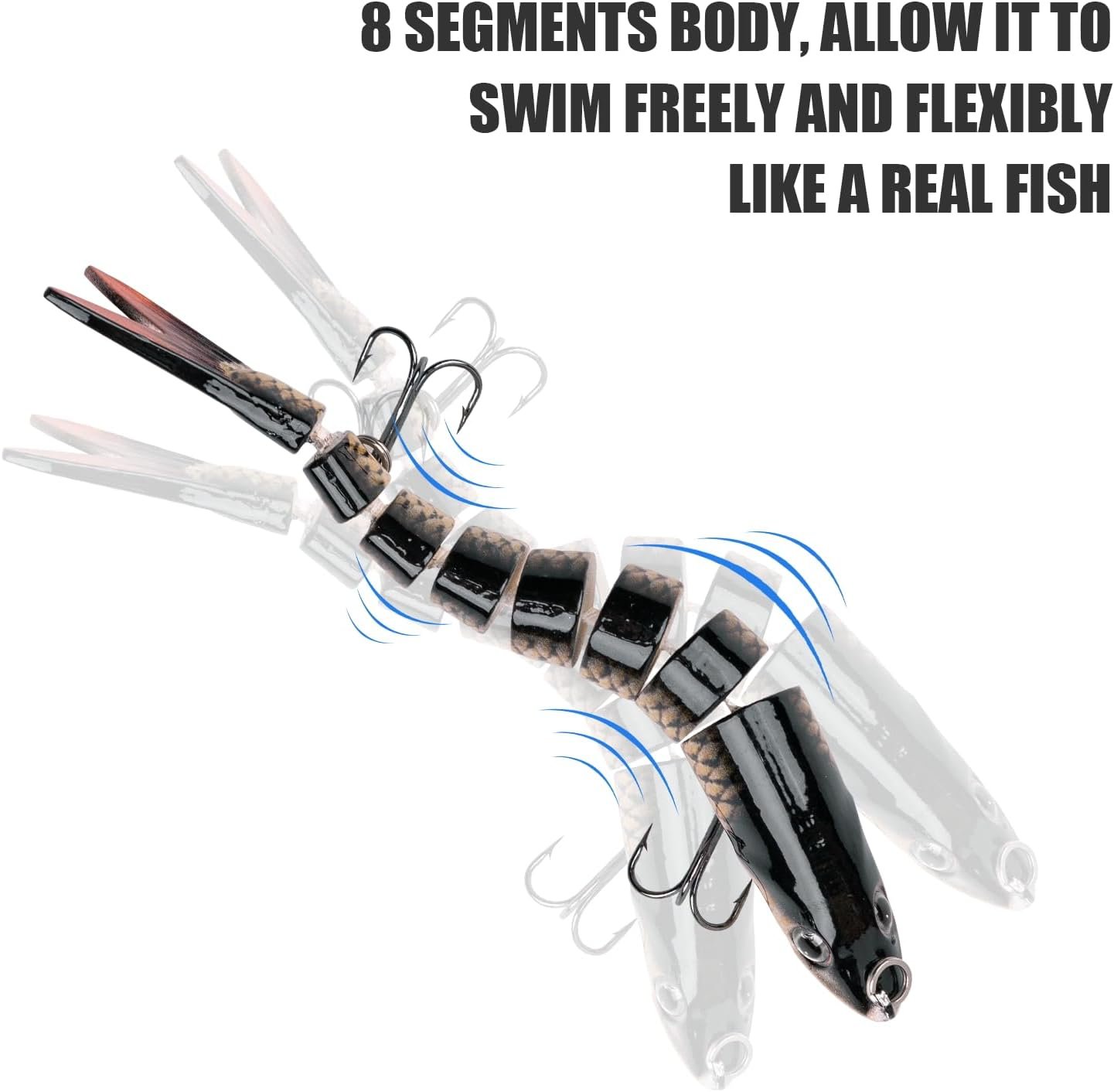 Diseño multiarticulación: el cuerpo principal del swimbait articulado se divide en ocho secciones, que pueden hundirse lentamente y moverse de forma flexible en el agua y provocar un ataque por peces depredadores Cebo realista: los señuelos de pesca de agua superior con ojos realistas 3D y revestimiento de polvo de perla, este cebos de natación multiarticulados parece muy vívido y parece un pez real Gancho afilado mejorado: la cabeza y la cola del cebo de baño microarticulado tiene ganchos con púas, y el gancho triple reforzado no tiene obstrucción que puede enganchar firmemente la boca del pez Fácil de lanzar: este señuelo animado tiene una bola de acero incorporada, contrapeso de ingeniería y peso razonable, lo que hace que los cebos articulados sean fáciles de lanzar desde una larga distancia. Incluso los principiantes son fáciles de operar Cebo ampliamente aplicable: Este señuelo de pesca biónico se puede utilizar ampliamente para atrapar lubina, perca amarilla, trucha, salmón y más. Este señuelo de lubina es adecuado tanto para agua salada como para agua dulce y funciona bien en todas las capas de agua