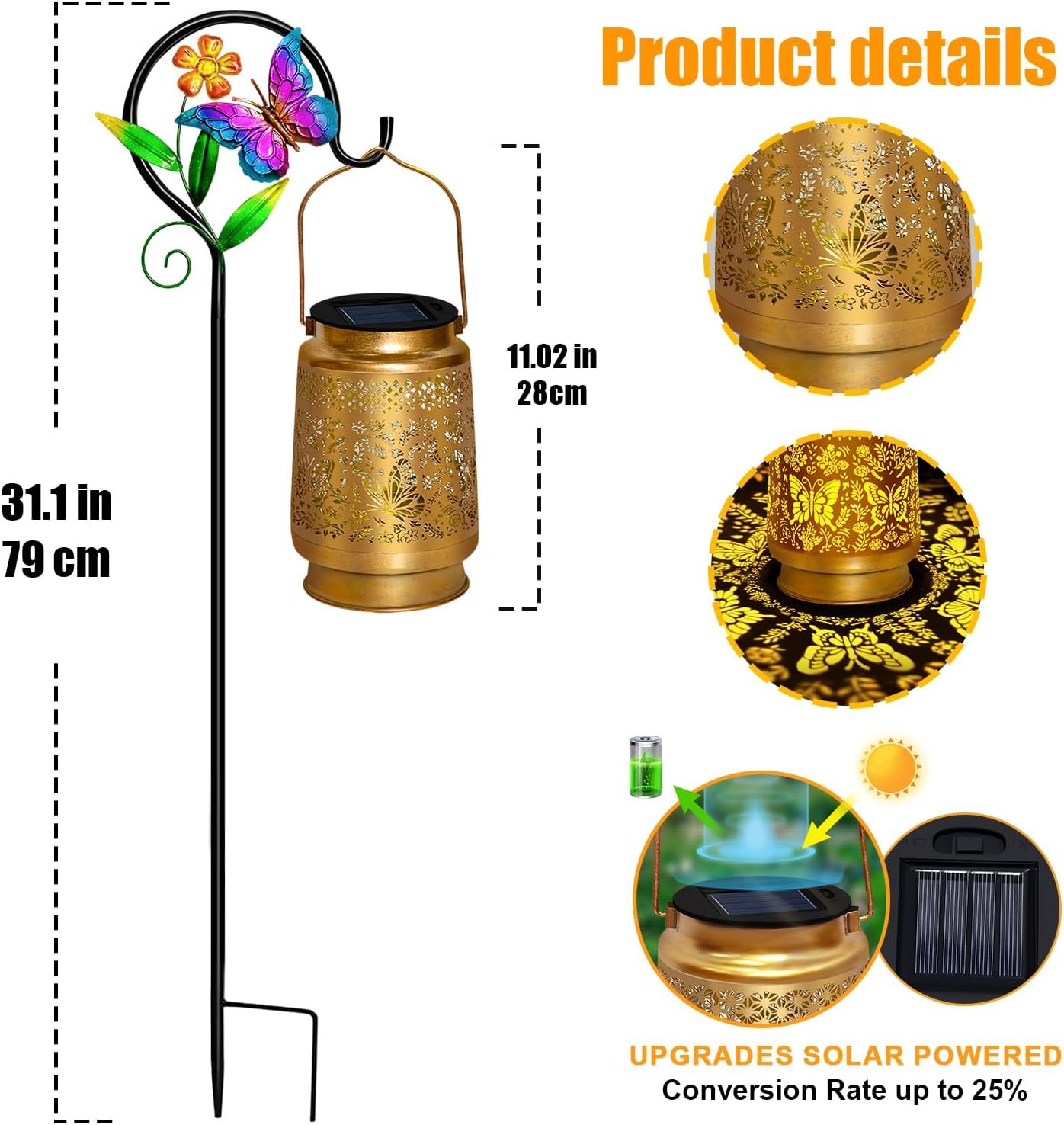 Encantadora linterna de mariposa alimentada por energía solar: esta hermosa linterna solar de mariposa cuenta con intrincados recortes de mariposa que emiten patrones mágicos cuando se enciende, creando un ambiente encantador para tu jardín o patio. Es una decoración de mariposa elegante y eficiente que se ilumina automáticamente al anochecer. Diseño exquisito con detalles de mariposa vívidos: adornada con patrones de mariposa detallados en el cuerpo de la linterna y coronado con una mariposa colorida y realista en la parte superior, esta pieza sirve como una impresionante pieza de decoración de jardín de mariposas incluso durante el día. Regalo único y reflexivo para mujeres: una opción perfecta para regalos para mujeres que aprecian los delicados detalles inspirados en la naturaleza y los delicados detalles del hogar. Esta linterna de mariposa es un regalo único para cumpleaños, Día de la Madre o inauguraciones de la casa, trayendo alegría a cualquier destinatario. Luces solares de mariposa resistentes a la intemperie: diseñadas específicamente como luces solares de mariposa para uso en exteriores, estas luces son duraderas y resistentes a la intemperie. Simplemente coloca las luces solares de mariposa para exteriores en un lugar soleado; se cargan durante el día e iluminan tus noches sin esfuerzo. Fácil instalación y transformación mágica del jardín: sin cableado ni costos de electricidad, esta luz solar de mariposa es increíblemente fácil de instalar. Simplemente empuja la estaca en el suelo. Transforma sin esfuerzo tu espacio al aire libre en una cautivadora decoración de jardín de mariposas, mejorando tus noches con un brillo suave y cálido.