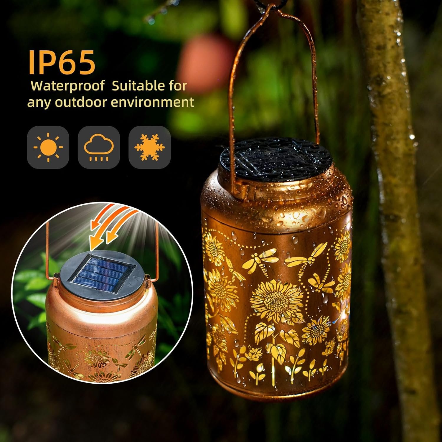 Patrón exquisito: la linterna solar colgante de libélula adopta un diseño hueco retro con luz cálida con patrón de girasol, emitiendo hermosos patrones en la pared o césped, regalos de Navidad para familia, mamá, mujer, abuela, cumpleaños, hermana, amistad y amigos durante las vacaciones. Tamaño: 18,3 cm de alto x 11,2 cm de ancho x 11,2 cm de largo. Regalo de jardinería: las linternas solares de girasoles al aire libre impermeables bailan alrededor de la libélula, y la luz se proyecta en la mesa o el suelo para crear un hermoso patrón realista, haciendo que tu patio destaque. La linterna de libélula de regalo único es perfecta para interiores, patio, caminos, balcón, pasillos, patios y decoración del hogar. Es un gran regalo para el día del padre, día de la madre, Acción de Gracias, Navidad, día de San Valentín, Halloween, cumpleaños, boda, Año Nuevo y regalo de inauguración de la casa, regalo de cumpleaños para mujeres. Interruptor automático: nuestro panel solar está hecho de silicona monocristalina más grande y eficiente, se carga en 6-8 horas al sol y utiliza de 6 a 8 horas, asegúrate de que el botón esté en la posición cmON cm. Cuando cae la noche, estas linternas se encienden automáticamente, linterna de árbol parpadeante para decoración del hogar que añade un toque de color a tu porche, terraza, balcón o jardín. Resistente al agua IP65: la luz solar para exteriores está hecha de metal resistente y material ABS de alta resistencia con tratamiento antioxidante, asegurando durabilidad. Diseño impermeable IP65, con excelente resistencia a la intemperie. No tienes que preocuparte por la lluvia o la nieve, ya que puede proporcionar una buena iluminación incluso en días lluviosos o nublados. Buen servicio al cliente: estamos comprometidos a proporcionar a nuestros clientes la mejor experiencia. Si tienes alguna pregunta, no dudes en ponerte en contacto con nosotros. Ofrecemos una garantía de satisfacción de devolución de dinero de 30 días. Si la cubierta de la batería de la linterna no se enciende, comunícate con el vendedor para ayudarte a reemplazar la cubierta de la batería.