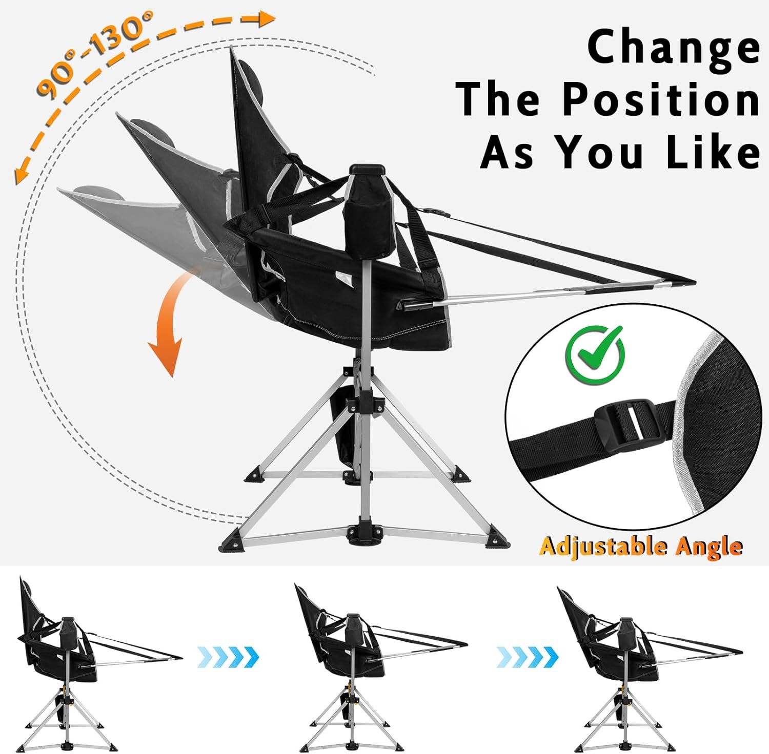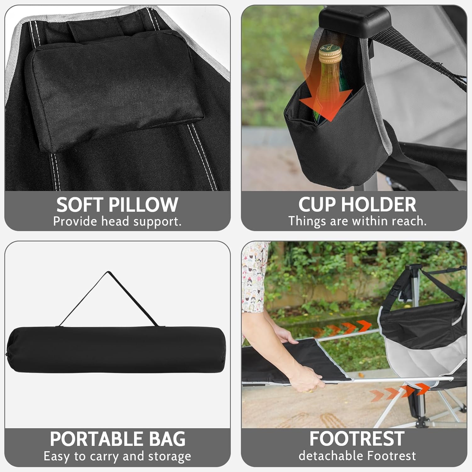 Reposapiés extraíble para una relajación total: se sincroniza con el suave columpio de tu silla hamaca para ofrecer comodidad de cuerpo completo. Esta silla hamaca con reposapiés eleva tus piernas para reducir la presión espinal hasta en un 30% y aliviar la fatiga de las articulaciones, ideal para largas horas de relajación en interiores o exteriores. Construcción fuerte pero ligera: construida con aluminio y acero de grado aeronáutico, esta silla de campamento oscilante soporta hasta 440 libras, pero pesa solo 13.1 libras. Los pies antideslizantes lo mantienen estable en cualquier superficie. Una selección resistente y portátil entre las sillas plegables para exteriores. Se instala en segundos y es fácil de transportar: despliega y fija el asiento; un cmclic cm significa que está listo. Incluye una bolsa de transporte para mayor comodidad sobre la marcha. Con portavasos, bolsillo lateral y almacenamiento para el reposapiés, esta silla hamaca plegable es tu compañero de columpio para exteriores. Asiento espacioso y transpirable: espaciosa y de apoyo, esta silla de campamento de gran tamaño cuenta con un asiento ancho y reposapiés extendido. Malla transpirable y tela Oxford 600D que te mantienen fresco y cómodo. Perfecto como silla hamaca para uso diario. Respaldo reclinable ajustable: personaliza tu comodidad con el respaldo reclinable. Muévete suavemente de vertical a relajado, ayudado por el reposacabezas acolchado y el reposapiés desmontable. La silla de campamento definitiva para leer, descansar o relajarse al aire libre.