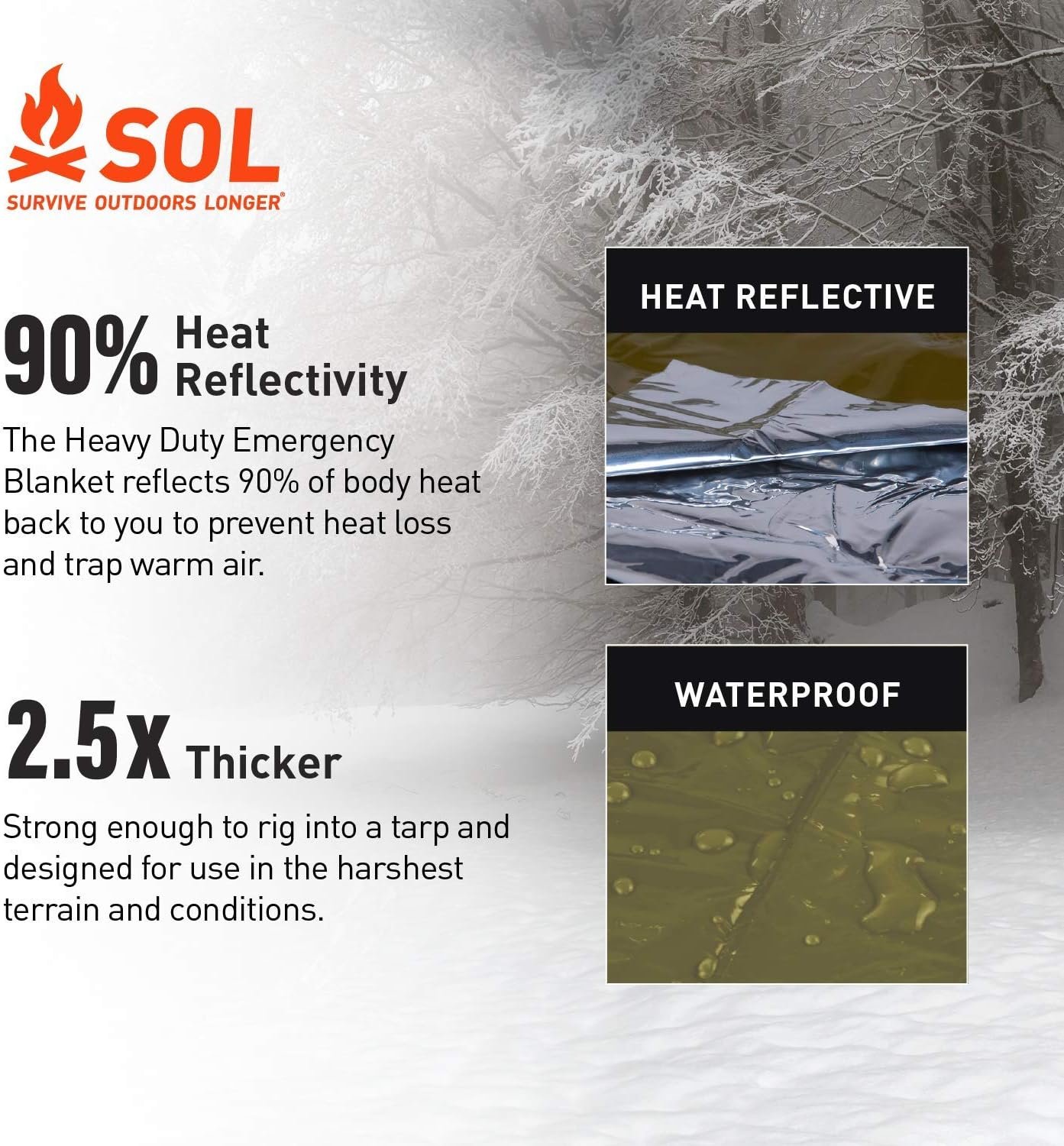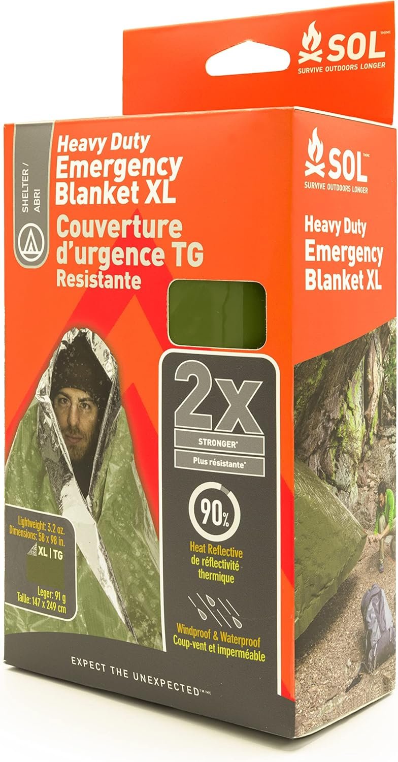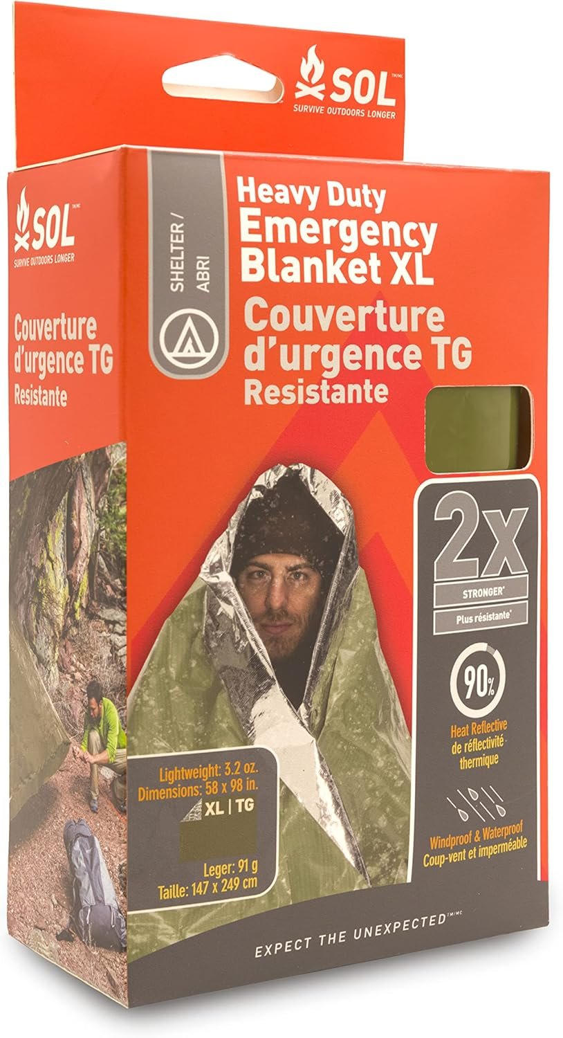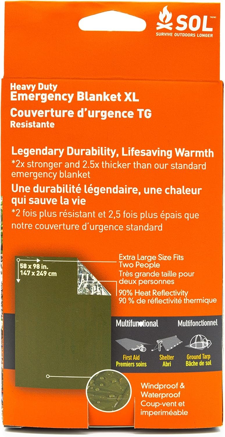 Polyetileno Retención compacta de calor: esta manta reflectante de calor, de 147,3 cm x 248,9 cm, es ideal para cualquier kit de supervivencia y es 2 veces más fuerte que las mantas de emergencia tradicionales, ofreciendo versatilidad y calidez en emergencias Manta de supervivencia SOL duradera: nuestra manta de rescate de polietileno metalizado al vacío resiste pinchazos, doblándose como una lona de tierra, refugio de emergencia, cubierta de engranajes y más Refugio resistente a la intemperie: como parte de su equipo de emergencia, esta manta impermeable, resistente al viento y a prueba de desgarros proporciona un refugio confiable contra los elementos Seguridad visible: el naranja de alta visibilidad hace de esta manta de emergencia SOL una señal de rescate vital en diversos entornos, perfecta para un kit de preparación para desastres SOL Heat Reflection: diseñada como un componente clave de un kit de emergencia, esta manta refleja el 90% del calor corporal, vital para la supervivencia