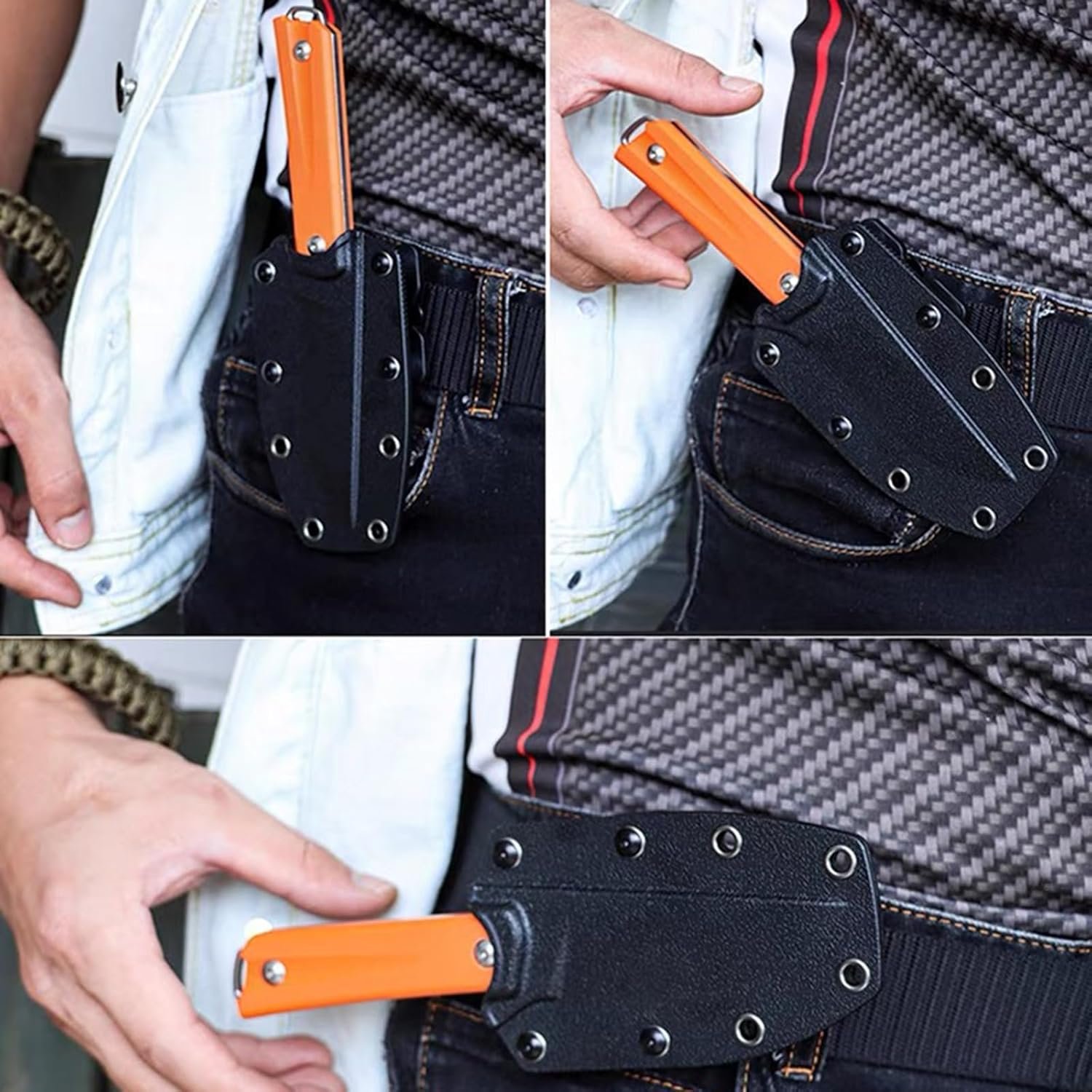 Longitud total: 7.717 in. Peso del producto: 4.37 oz. Grosor de la hoja: 0.138 in. Longitud de la hoja: 3.740 in. Longitud del mango: 3.976 in. Grosor del mango: 0.454 in Hoja integrada de 0.122 in de grosor, tratamiento superficial de la cuchilla lavada a la piedra, hoja de pulido cóncava en forma de V, área de carga de gran fuerza de la hoja, resistencia a la corrosión, resistente al desgaste y resistente a la corrosión El mango grueso antideslizante G10 tiene una sensación cómoda en la mano, y la textura de la superficie puede proporcionar una mayor fricción al agarrar, lo que es beneficioso para sostener y no es fácil de quitar Equipado con una cómoda funda de cuchillo, ligera y conveniente, se puede colgar en la cintura de los pantalones para un uso fácil. El diseño del orificio de fuga de la funda puede drenar rápidamente el agua acumulada dentro de la funda, manteniéndola seca La hoja está hecha de acero 8Cr13MoV y ha sido sometida a un tratamiento frío y caliente, con una dureza de 57 ± 2 y alta nitidez y dureza