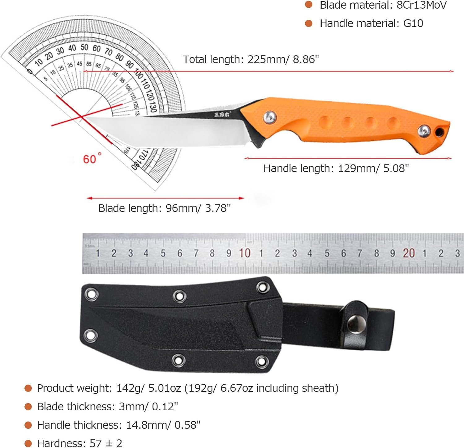 Longitud total: 8.858 in. Peso del producto: 5.01 oz. Longitud del mango: 5.079 in. Grosor del mango: 0.583 in. Material de la hoja: 8Cr13MoV. ; Tratamiento superficial de la hoja: lijado; Dureza: 57 ± 2 Diseño de mango G10, superficie incrustada con mango de material G10, resistente y resistente al desgaste. Diseño de curva de borde de hoja, más adecuado para cortar. Hoja inclinada, adecuada para cortar artículos duros como cuerdas Material de la cuchilla 8Cr13MoV, hoja de alta dureza con estabilidad, resistencia a la corrosión, resistencia al desgaste. Los cuchillos Sanrenmu han estado usando e investigando durante 20 años, y están familiarizados con el control de acero y los procesos de tratamiento térmico Diseño de quilla integrado, con una conexión perfecta entre la hoja y el mango, lo que hace que sea difícil de romper y fácil de limpiar Equipado con una funda práctica, ligera y conveniente, se puede colgar en la cintura de los pantalones y utilizar en cualquier momento y en cualquier lugar