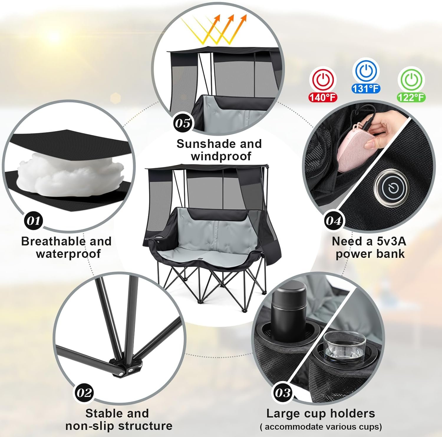 Resistente al viento y protección solar: la silla de camping doble climatizada 0ur con toldo cuenta con parasoles laterales y traseros para bloquear la luz solar desde todos los ángulos, asegurando la máxima refrigeración y protección UV. Disfruta de aventuras al aire libre sin preocuparte por la exposición al sol Gran área de calefacción y temperatura ajustable de 3 niveles: la silla de campamento con calefacción doble cuenta con 4 zonas de calefacción que calientan rápidamente las caderas y la espalda después de encenderla. Cada asiento tiene un interruptor independiente con 3 ajustes de calor: alto (rojo 122°F), mediano (verde 113°F) y bajo (azul 104°F). Alimentado por un banco de energía de 5 V/3 A (no incluido) Diseño espacioso y cómodo: mide 119,9 cm x 50,8 cm, esta silla de campamento doble proporciona un amplio espacio para dos. Hecho de tela Oxford duradera y algodón de doble capa, asegurando comodidad y calidez con un toldo resistente al viento Construcción resistente y duradera: construida con un marco de acero fuerte, esta silla de césped con calefacción con paraguas soporta hasta 352 libras. Costuras reforzadas que garantizan estabilidad y durabilidad, por lo que es ideal tanto para uso en interiores como exteriores para años de disfrute Recordatorio: la tela puede arrugarse al primer uso. Después de configurar la silla climatizada para deportes al aire libre con dosel, apriete las correas traseras para mayor estabilidad. Siempre desabrocha los clips del parasol y las correas traseras antes de doblarlo para prolongar la vida útil de la silla