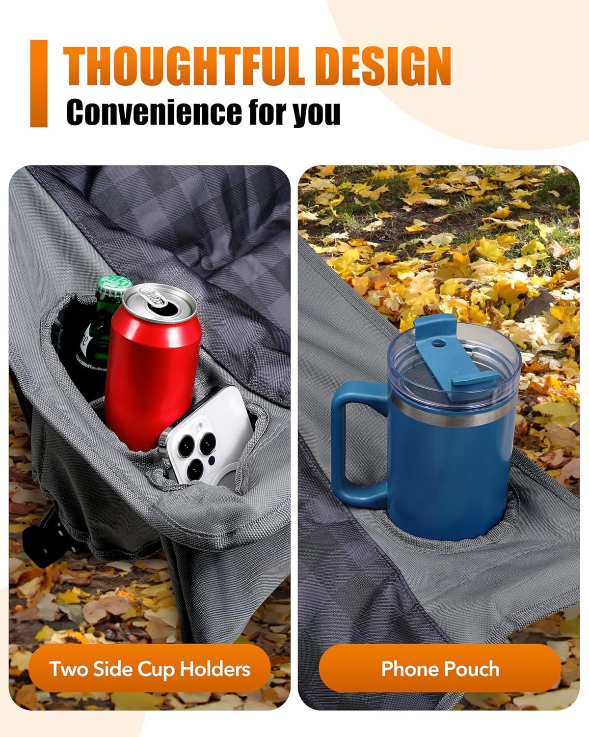 Estabilidad inigualable: reforzada con marco de acero resistente en forma de X y tubos de acero gruesos de 0.039 in de ancho, esta silla soporta 500 libras sin esfuerzo para un uso sin preocupaciones por todo tipo de cuerpo. El acabado con recubrimiento en polvo resiste el óxido y la decoloración, mientras que la tela Oxford 600D resistente a desgarros con costuras dobles garantiza años de uso resistente en senderos rocosos, playas de arena o fiestas fangosas en el portón trasero. Comodidad de lujo en la nube: la cómoda silla de camping disfruta de 2.5 libras de acolchado de algodón de alta calidad en reposacabezas, lumbar, reposabrazos y asiento, comodidad y transpirabilidad superiores. Se despliega en un espacioso trono de 98,0 cm de largo x 61,0 cm de ancho x 103,5 cm de alto, contorneando tu cuello/espalda/caderas para una relajación de presión cero durante juegos de 8 horas o sesiones de fogata de estrellas. Aventuras manos libres: portavasos dobles ajustables de gran tamaño, la silla de camping grande Pcuauld puede agarrar de forma segura para bebidas. Bolsillos laterales para guardar teléfonos, todo al alcance de la mano. ¡Nunca más luches por el equipo mientras pesca, asa a la parrilla o animas en torneos! Portátil y de instalación rápida: pliega la silla plegable acolchada extra ancha para un tamaño compacto en segundos y se desliza en una bolsa de transporte incluida estilo mochila, pesa solo 14.1 libras para un transporte sin esfuerzo a juegos deportivos o viajes de senderismo. Compañero versátil para exteriores: diseñado para cualquier escapada: el diseño de patas en ángulo se estabiliza en suelos irregulares, mientras que la tela transpirable resiste el sol y la lluvia. Silla de exterior de gran tamaño que es ideal para acampar, pescar, hogueras, conciertos y eventos de estadio, combina un rendimiento resistente y resistente con una relajación lujosa.