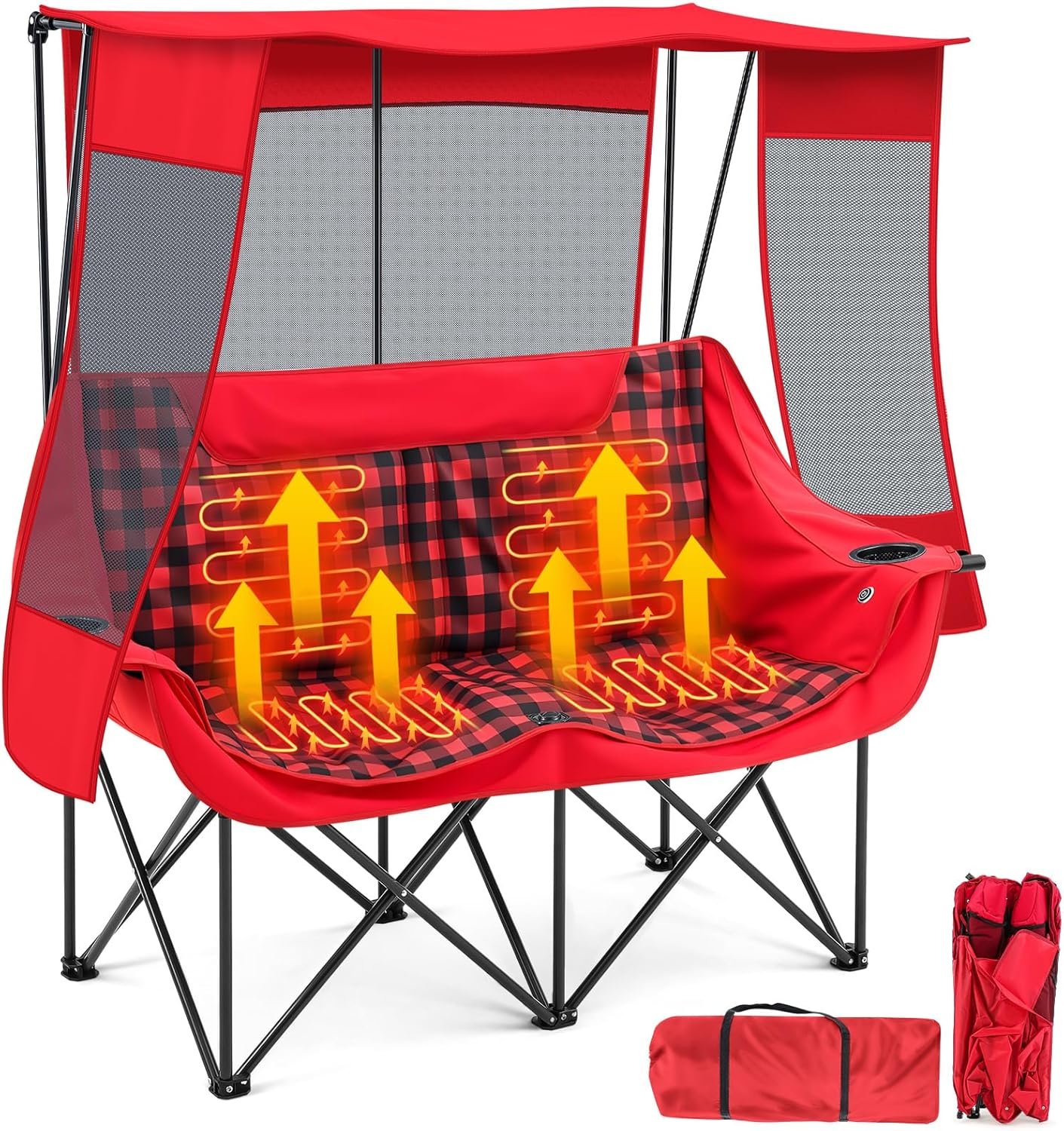Cómodo acolchado grueso: el asiento y el respaldo de esta silla de campamento doble cuentan con acolchado alto para mayor apoyo lumbar y de espalda; mide 119,9 cm x 50,8 cm, proporciona un amplio espacio para dos personas. Nota: para garantizar un calentamiento eficaz, nuestro calentador utiliza un banco de energía de 5 V 3 A (banco de energía no incluido) Mantente caliente y a la sombra del sol: disfruta de tus aventuras al aire libre sin preocuparte por la luz solar directa. Nuestra silla de campamento doble cuenta con viseras laterales y traseras que bloquean eficazmente la luz solar desde todos los ángulos, asegurando la máxima refrigeración y protección UV efectiva en climas ventosos; las viseras laterales se pueden asegurar fácilmente con tiras adhesivas, y los botones internos del toldo se extienden completamente para mantener la silla caliente durante el uso en invierno Calidez y comodidad: la silla de campamento con calefacción doble tiene cuatro zonas de calefacción; después de encender, mantén presionado el interruptor durante 3 segundos para calentar rápidamente las caderas y la espalda; cada asiento está equipado con un interruptor para controlar independientemente la temperatura del asiento, alta (rojo 122 grados Fahrenheit), medio (verde 113 grados Fahrenheit), bajo (azul 104 grados Fahrenheit); utiliza un banco de energía móvil de 10,000 mAh. puede proporcionarle De 5 a 10 horas de calor cómodo a largo plazo (batería externa móvil no incluida) Diseño portátil: la silla de campamento con doble calefacción con toldo es compacta cuando está plegada, por lo que es fácil de almacenar y transportar; el robusto marco de acero tubular hace que el asiento sea más estable; está hecha de tela Oxford 600D y tiene función impermeable; es la silla de campamento preferida para deportes al aire libre Tu zona de comodidad al aire libre todo en uno: ya sea que estés acampando bajo las estrellas, animando el juego o disfrutando de una hoguera en el patio trasero, este sofá biplaza con calefacción te tiene cubierto; el espacio adicional, dos portavasos grandes y la calidez compartida lo convierten en el mejor asiento al aire libre para parejas, amigos o familia, y un regalo inolvidable para cualquier ocasión