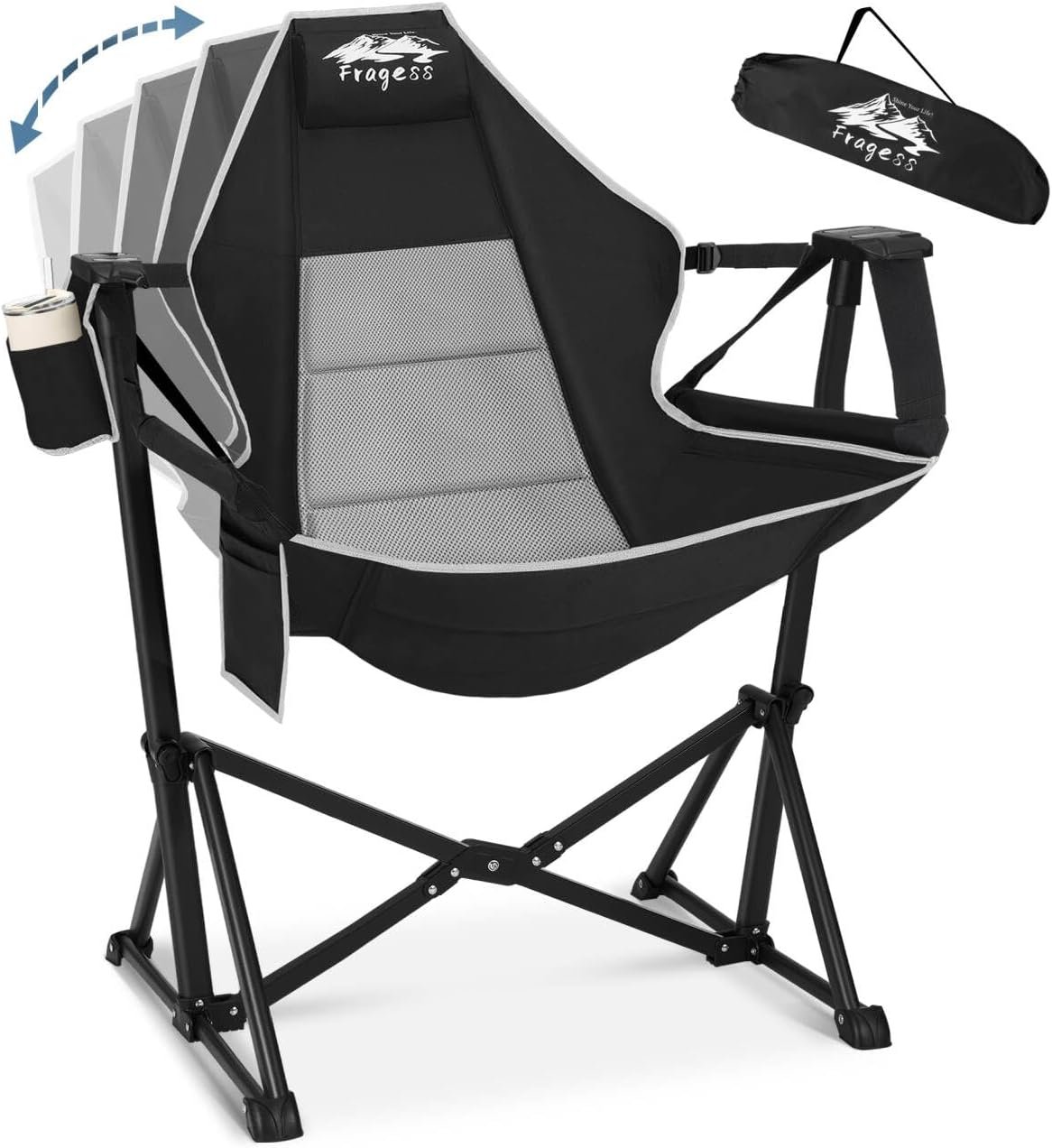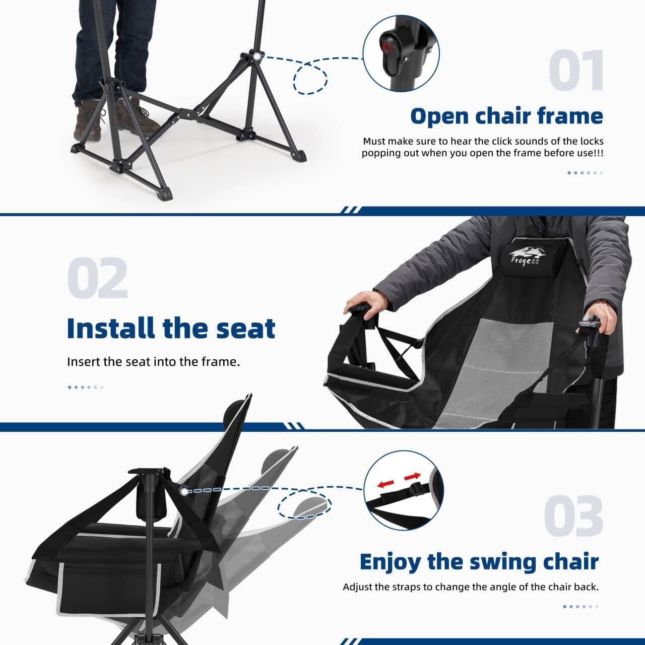 Oxford Máxima comodidad: silla hamaca de camping Fragess con respaldo acolchado ajustable, reposabrazos, reposacabezas, bolsillo lateral y portavasos. Con un ancho de 69,8 cm, la silla de camping hamaca es lo suficientemente espaciosa como para proporcionar la máxima comodidad. El respaldo ajustable te ayuda a encontrar la sesión óptima, disfruta de tus aventuras al aire libre con una silla de campamento oscilante. Tamaño de la silla de camping: 119,4 cmx99,1 cmx76,2 cm. RESISTENTE: La silla hamaca plegable está fabricada con tubos de acero y tela Oxford de doble capa, con un diseño cruzado triangular que garantiza estabilidad y seguridad cuando está en uso. La capacidad de carga de la hamaca de camping es de 330 libras, una silla de campamento ideal para adultos. Silla de campamento portátil: el marco integrado único permite que la silla hamaca portátil se pliegue en un tamaño compacto para un fácil almacenamiento y transporte. El tamaño plegable de la silla columpio de camping es de 90,2 cm x 25,4 cm x 25,4 cm y el peso es de solo 11.6 libras para que puedas llevarla a campamentos, viajes en caravana, viajes, eventos en estadios, conciertos, observadores de estrellas y días de playa. Fácil de usar: despliega fácilmente la silla hamaca en segundos, abre el marco de acero y cuelga el cojín. Nota: ¡Debe asegurarse de escuchar los sonidos de clic de las cerraduras que salen cuando abra la mecedora de camping antes de usar! ! SERVICIO POST-VENTA: no dudes en ponerte en contacto con nosotros si tienes algún problema, el equipo de Fragess te proporciona un servicio las 24 horas