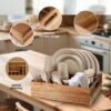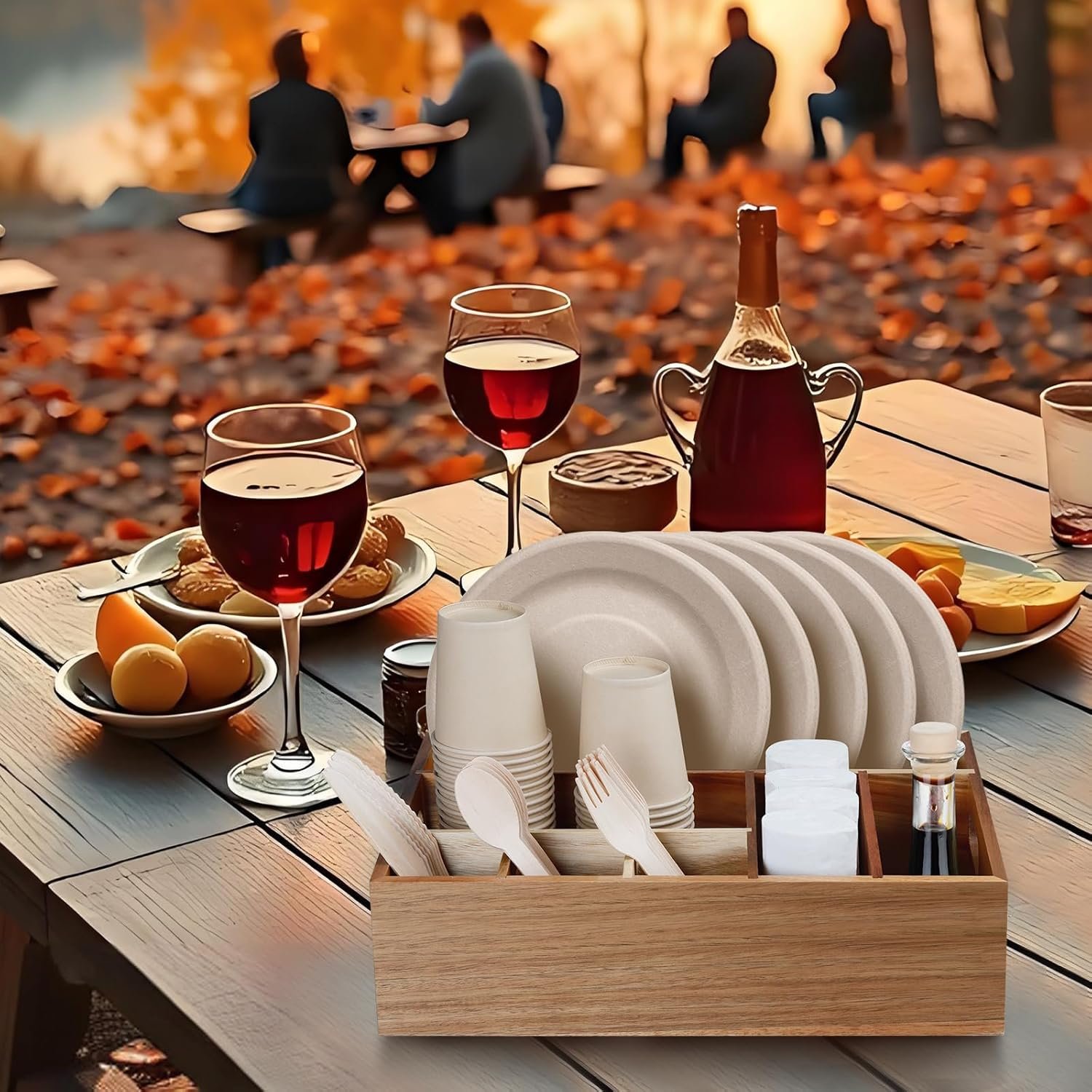 Elegante organizador de platos y utensilios: el soporte para utensilios de madera de acacia BOTOP cuenta con un diseño de seis compartimentos para almacenar vasos de papel, cucharas de plástico, tenedores, cuchillos, platos desechables, servilletas y otros vajillas. Esencial para fiestas: las asas dobles integradas garantizan una fácil portabilidad, por lo que es el compañero perfecto para barbacoas y picnics. Ideal para cenas en interiores y exteriores, eventos, bodas, reuniones corporativas, celebraciones de vacaciones y mucho más. Nunca vuelva a buscar en los cajones tenedores, cucharas o platos cuando entretener a los invitados. Organizador de utensilios de cocina: este organizador de utensilios de madera de acacia organiza eficientemente las herramientas de cocina. Guarda todos los utensilios de cocina en el interior para un acceso rápido y ahorro de tiempo mientras libera espacio en el armario y el cajón. Decoración vintage para encimera: el organizador de cubiertos de madera de acacia añade encanto vintage a encimeras, mesas de comedor y áreas de comedor, ofreciendo una solución atractiva y práctica para cajones y superficies de cocina desordenados. Elección de regalo ideal: combina funcionalidad con encanto rústico, es un regalo perfecto para amigos y familiares. Ya sea para Navidad, inauguración de la casa, cumpleaños o Acción de Gracias, seguro que deleitará a los destinatarios.