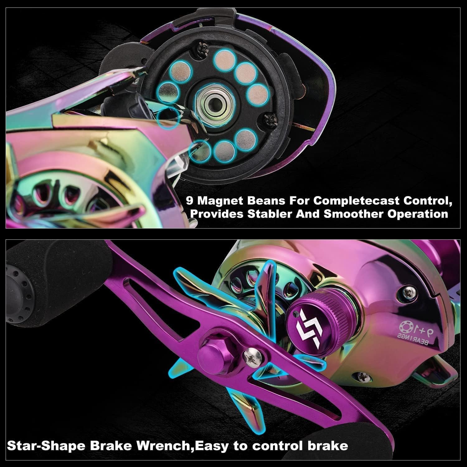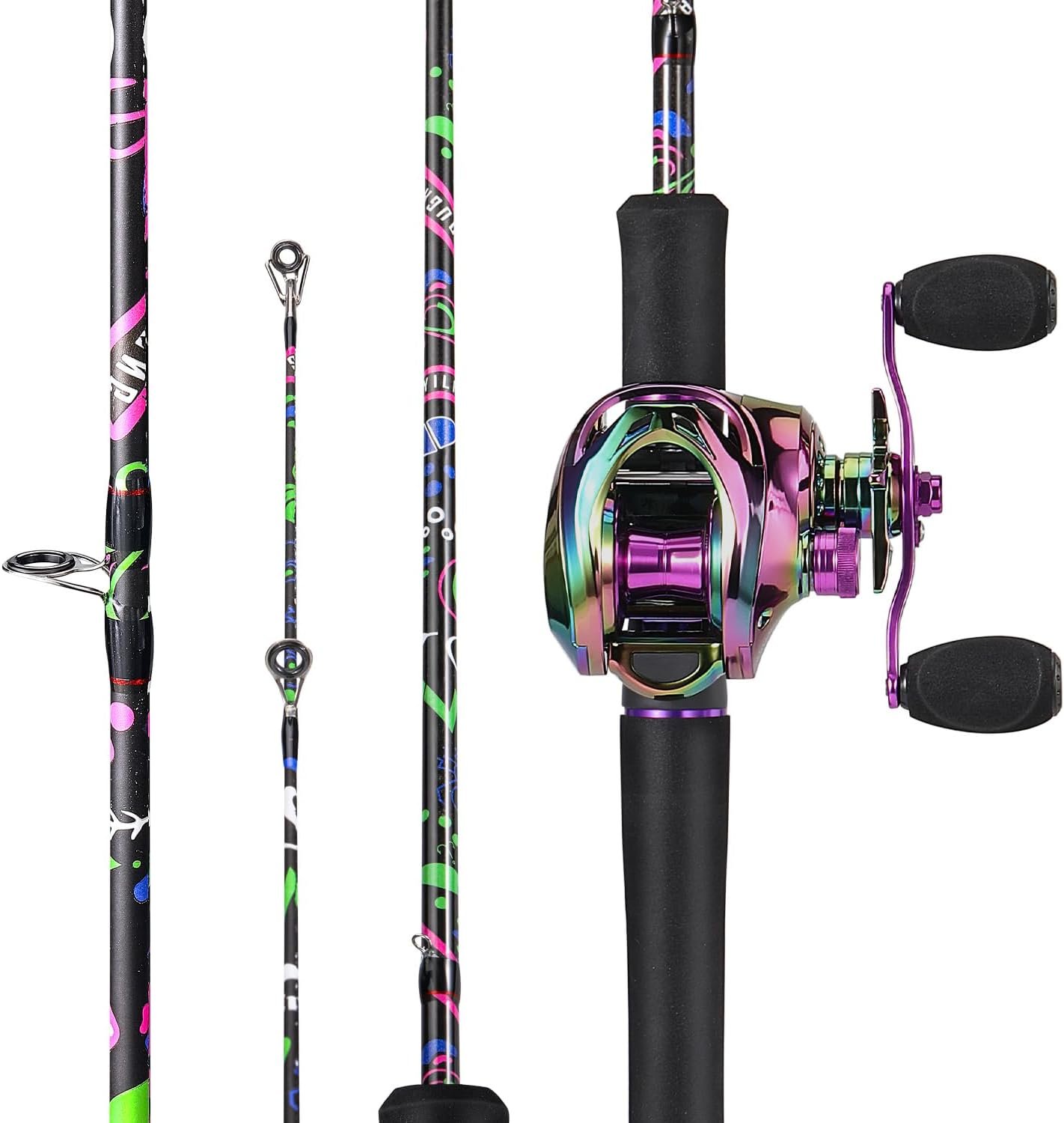 Peso pluma y duradero: hecha de material de carbono de alta calidad, esta caña de pescar es increíblemente resistente pero increíblemente ligera, por lo que es perfecta para largas horas de pesca sin fatiga. Impresión única de transferencia de agua: Destaque en el agua con el llamativo diseño de impresión de transferencia de agua que es novedoso y elegante, haciendo que su experiencia de pesca sea aún más agradable. Cómodo y antideslizante: el mango de EVA integrado de alta densidad proporciona un agarre cómodo y antideslizante, asegurando un agarre seguro y máximo control durante el lanzamiento y el enrollado. Fundición suave con guías de acero inoxidable y cerámica: Las guías de acero inoxidable y cerámica a lo largo de la caña de pescar minimizan la fricción, evitando daños a la línea de pesca y asegurando una fundición suave y eficiente en todo momento. Increíble carrete de baitcasting: ofrece una experiencia de pesca suave con una relación de engranaje de 6.5:1, sistema de frenado magnético simple, equipado con rodamientos de bolas 9+1 y funciones de arrastre trasero, ofrece durabilidad y resistencia. Excelente rendimiento: el nuevo combo de carrete de cebo Sougayilang está diseñado para un valor y rendimiento excepcionales. El carrete está mecanizado de aleación de aluminio, lo que no solo reduce el peso, sino que también permite una fundición larga y precisa Portátil: este combo de caña y carrete es tan atractivo y potente que puedes llevarlo a cualquier lugar que quieras pescar para una amplia gama de especies, incluyendo lubina, mahi-mahi, trucha y especies costeras populares como el pez rojo