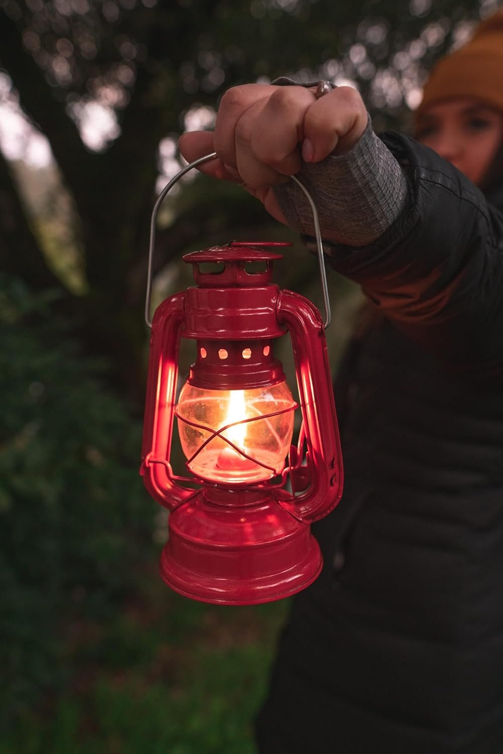 La linterna de huracán duradera de 20,3 cm es decorativa y funcional para camping, patio trasero o decoración de interiores Linterna clásica de globo de vidrio con alambre protector, construcción de metal y acabado rojo Incluye mecha con perilla de control para un brillo totalmente ajustable Asa de transporte de metal para una fácil portabilidad Se recomienda queroseno o aceite de lámpara estándar, no llene en exceso